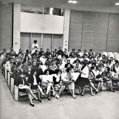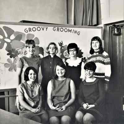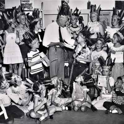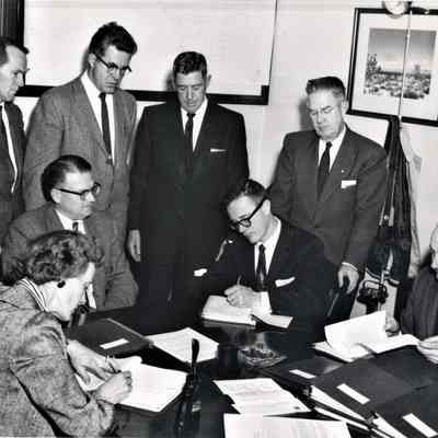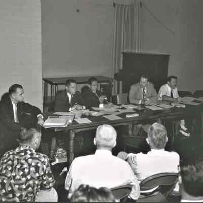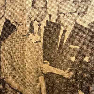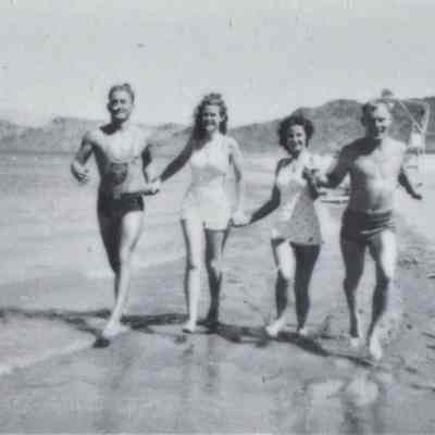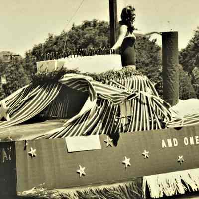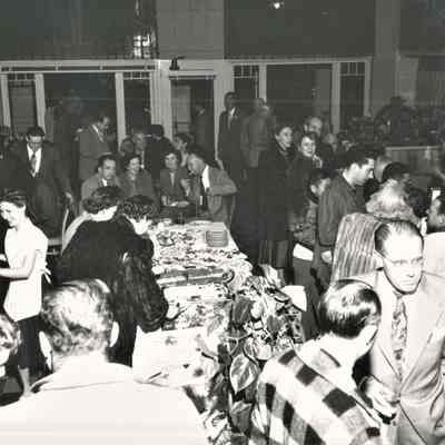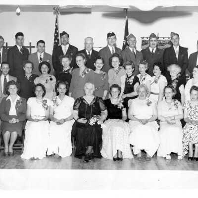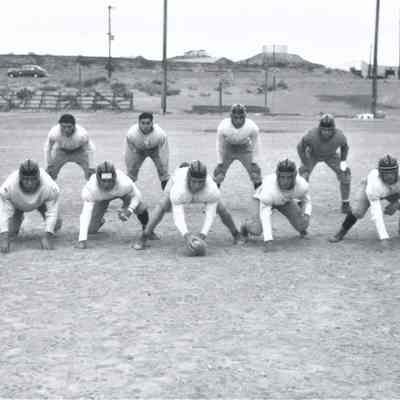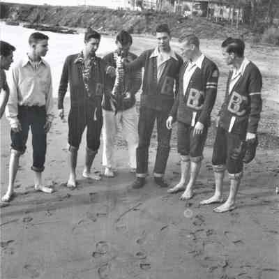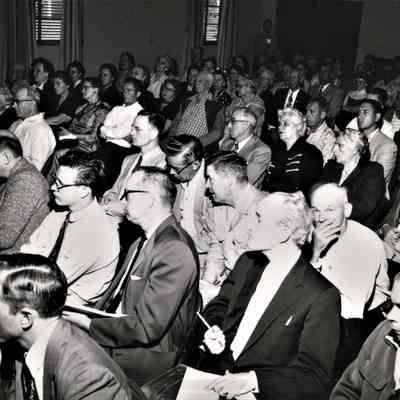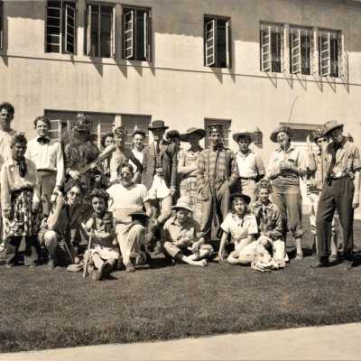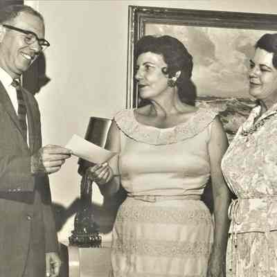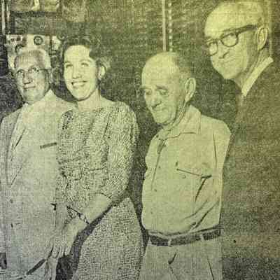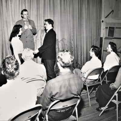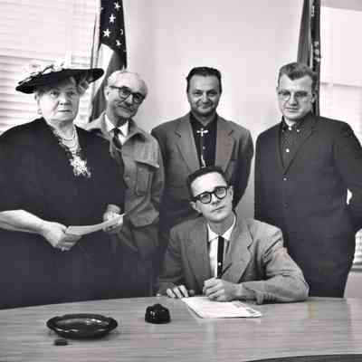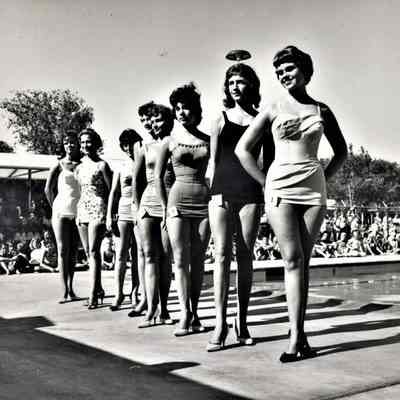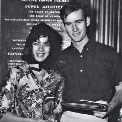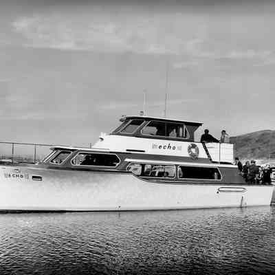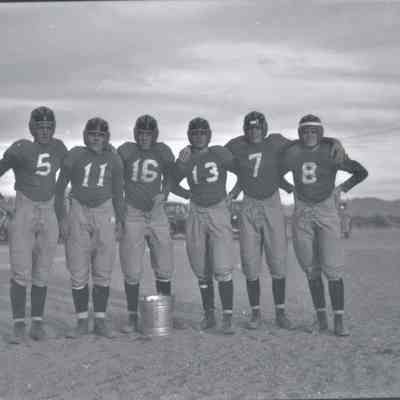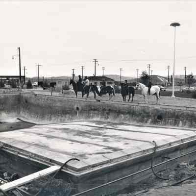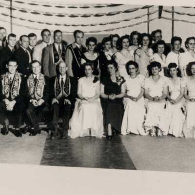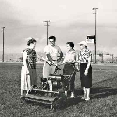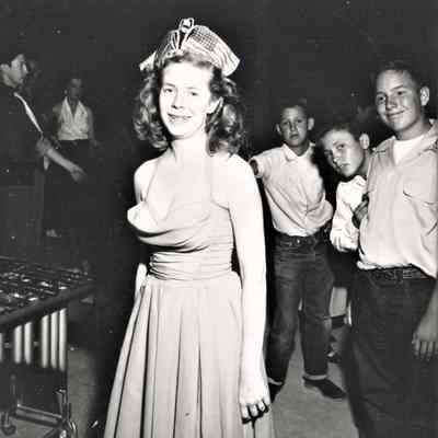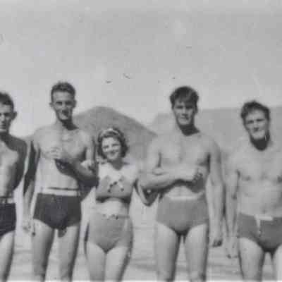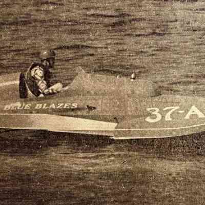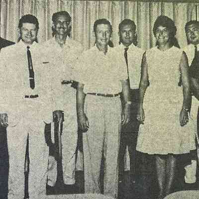 l-r: Bob Glinski; Elton Garrett; Jackie Brown & Hal Brown Boulder Dam Hotel owners; Dan Steelman Commodore of the Lake Mead Yacht Club front, l-r: Ann Underhill; Robin Killinger Queen of the 53rd Annual Gold Cup Race, Lake Mead. 1960