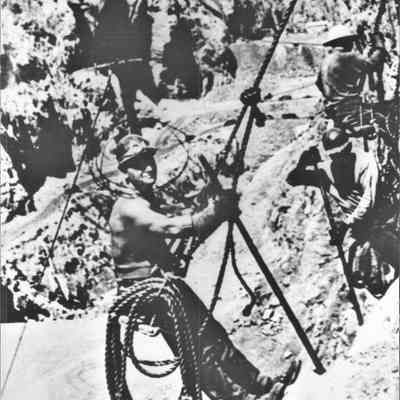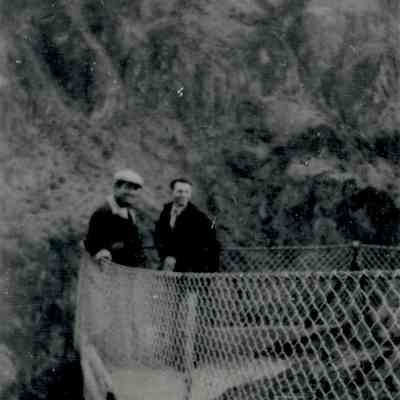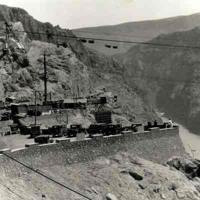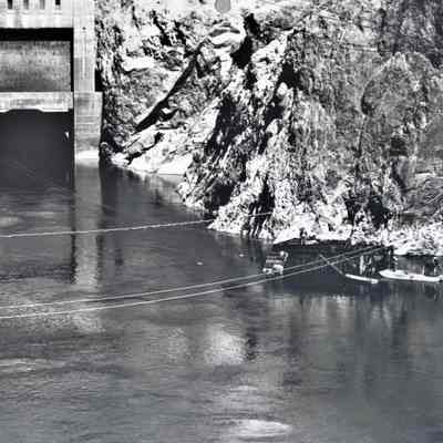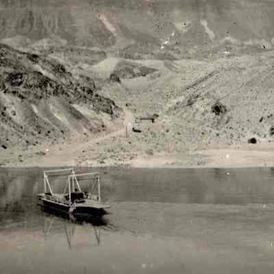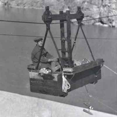 Aerial ferry across Colorado River below Searchlight at Cottonwood Landing 1930-35 showing Mr. R.J. Oppedyck.