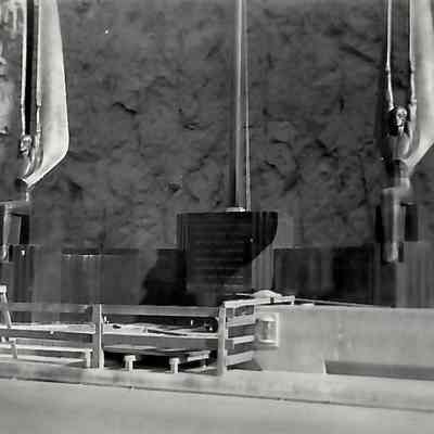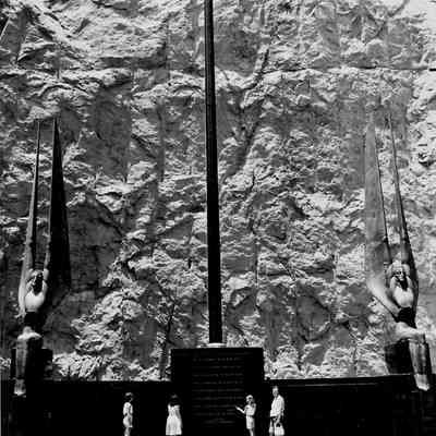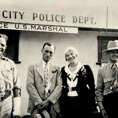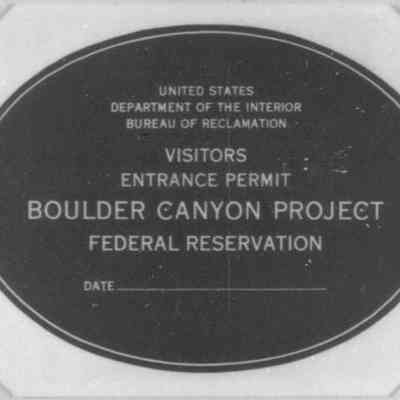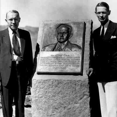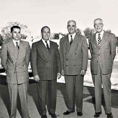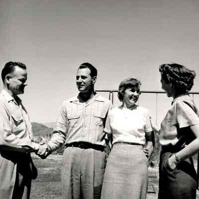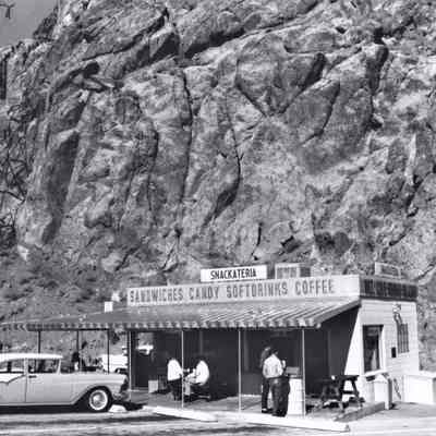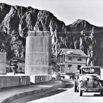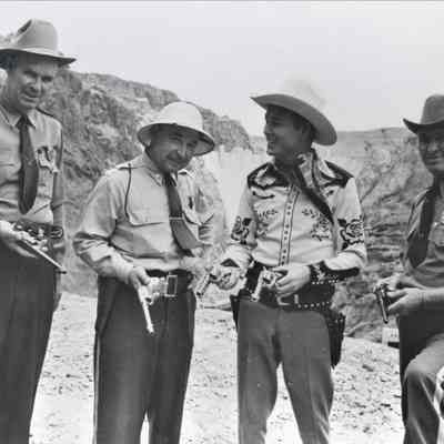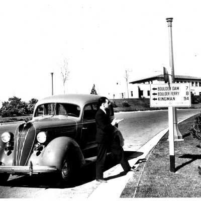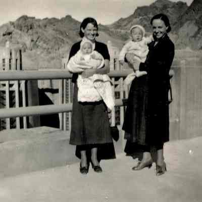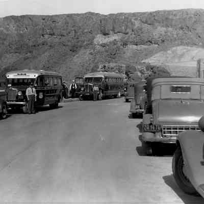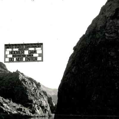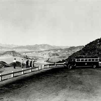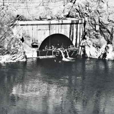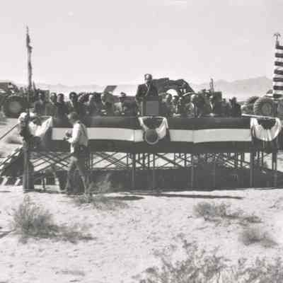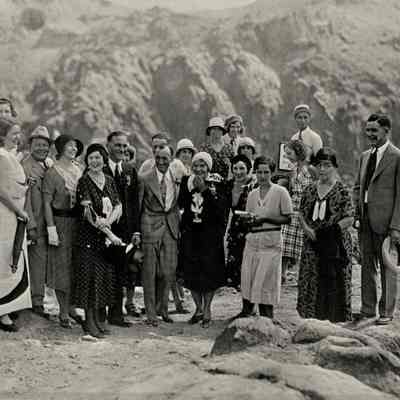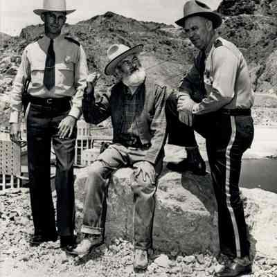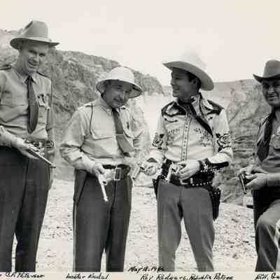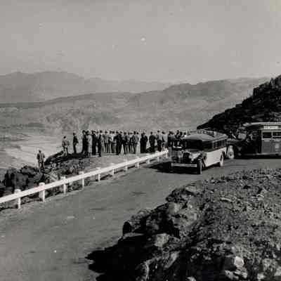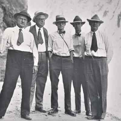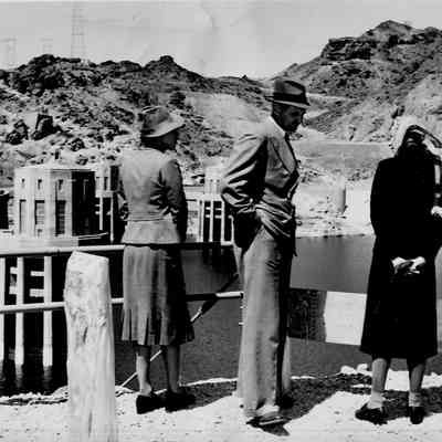 at the entrance to Black Canyon, 1920's l-r: AZ. Senator Henry Ashurst; Mrs. James G. Scrugham; NV. Senator James G. Scrugham; Senator Norris