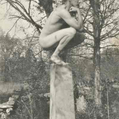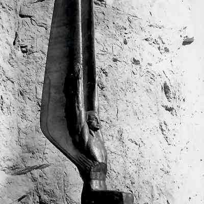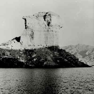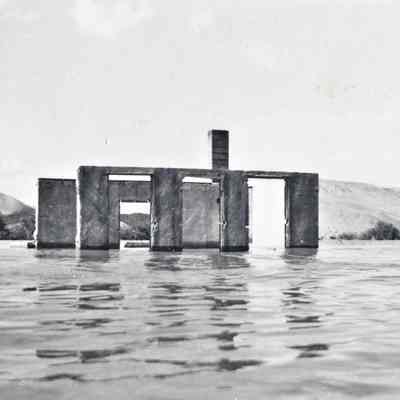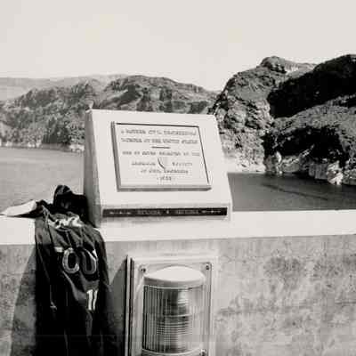 "Stake set on "D" Line by Homer Hamlin in 1916. Original Location. Site "D" was the one finally chosen for construction of Hoover Dam." [photo taken April 30, 1931]