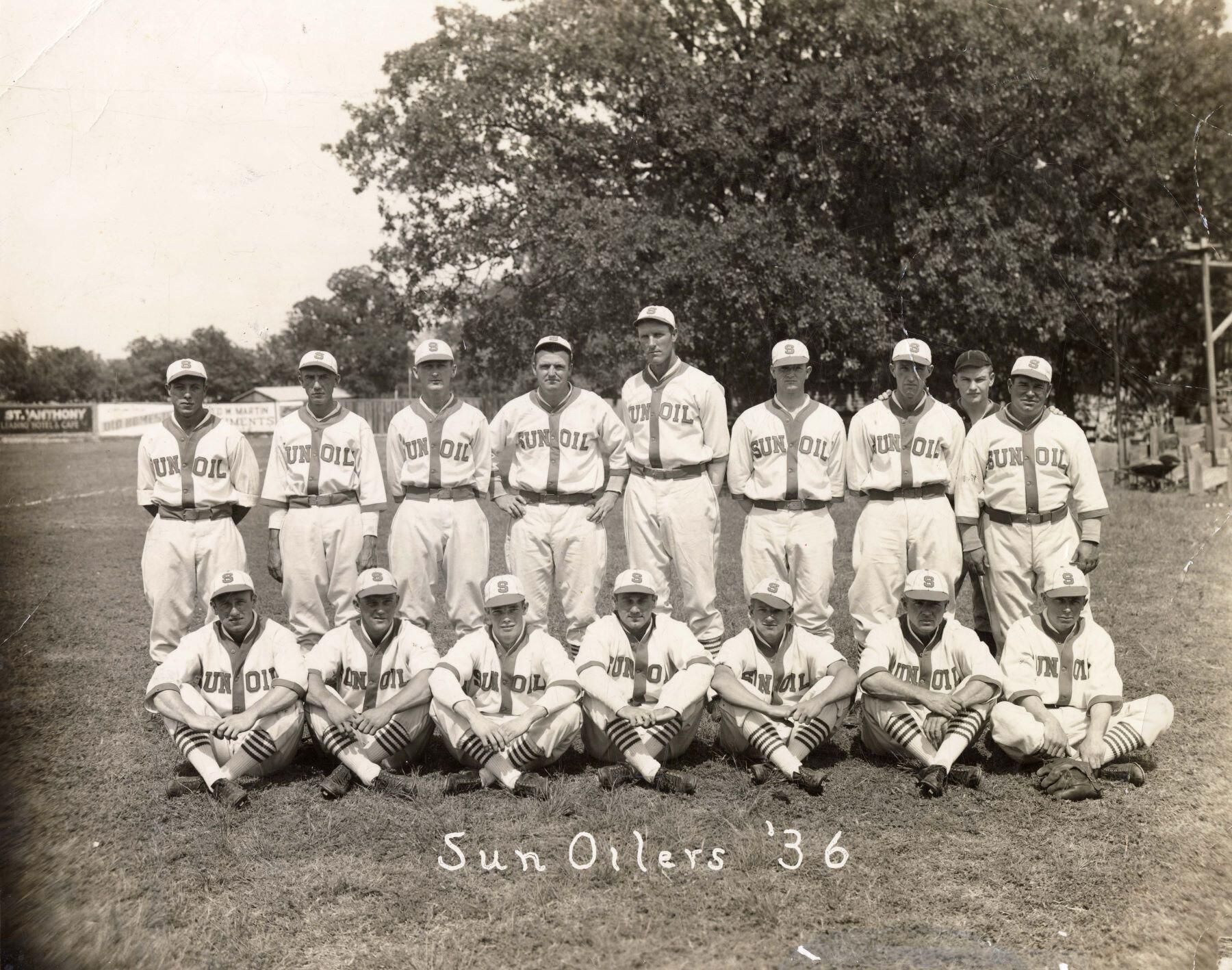Black and white; Sun Oilers Baseball team; 7 guys sit, 9 guys stand on field; names on back; 1936