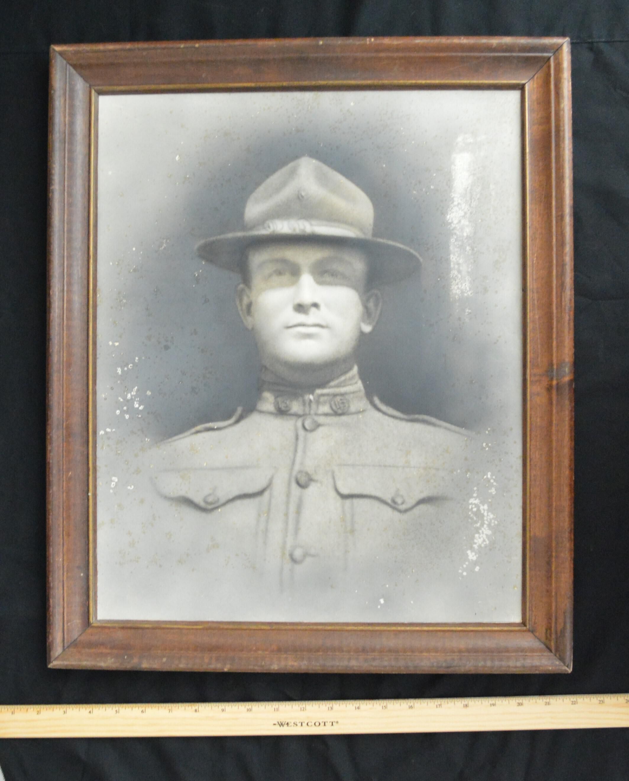 Black and white; Sgt. A. K. (Buddy) Wright Brenham soldier killed in WWI at St. Etienne, France, 1918; in WWI uniform; framed; Co. C 1141st Infantry; b 12-3-1893, d 10-8-1918