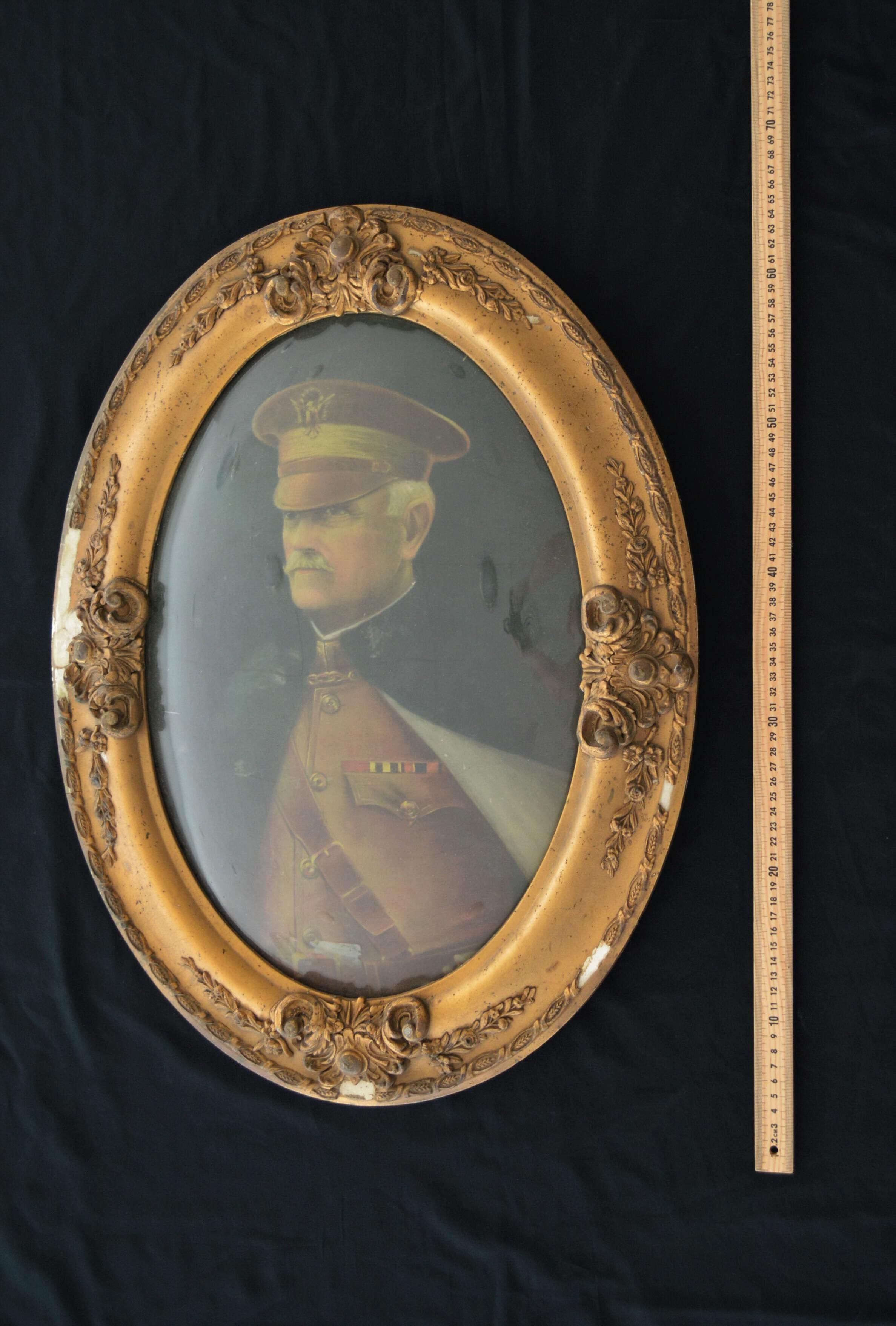 General Pershing; color image; dressed in American Expeditionary Forces uniform with brown leather Sam Browne Belt across his chest; has cape draped over shoulders with it open in front; oval gilded frame