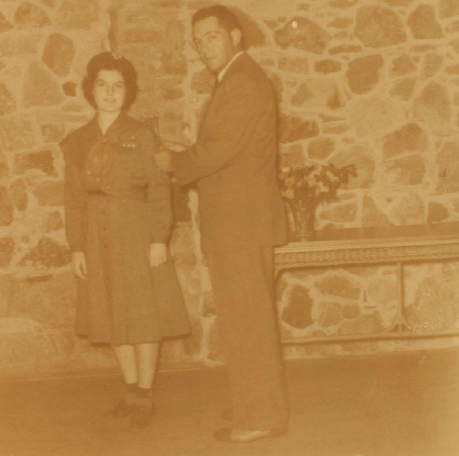 Color, older Girl Scout poss. being awarded by gentleman, stone wall in back poss. American Legion Hall Fireman's Park, 1952 Girl Scouts of America