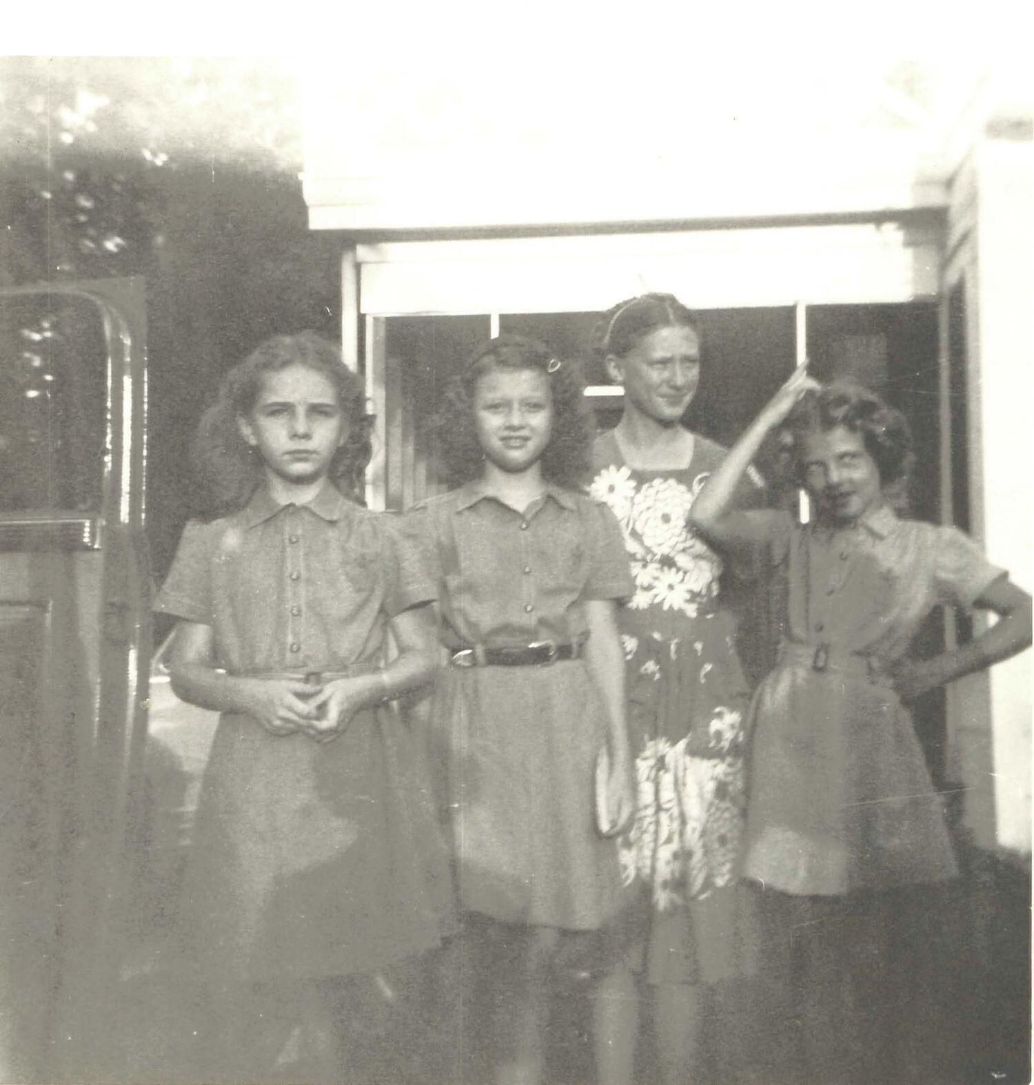 B/W, 3 young ladies in scout uniform & 1 women in sundress, taken outside Possibly Girl Scouts of America
