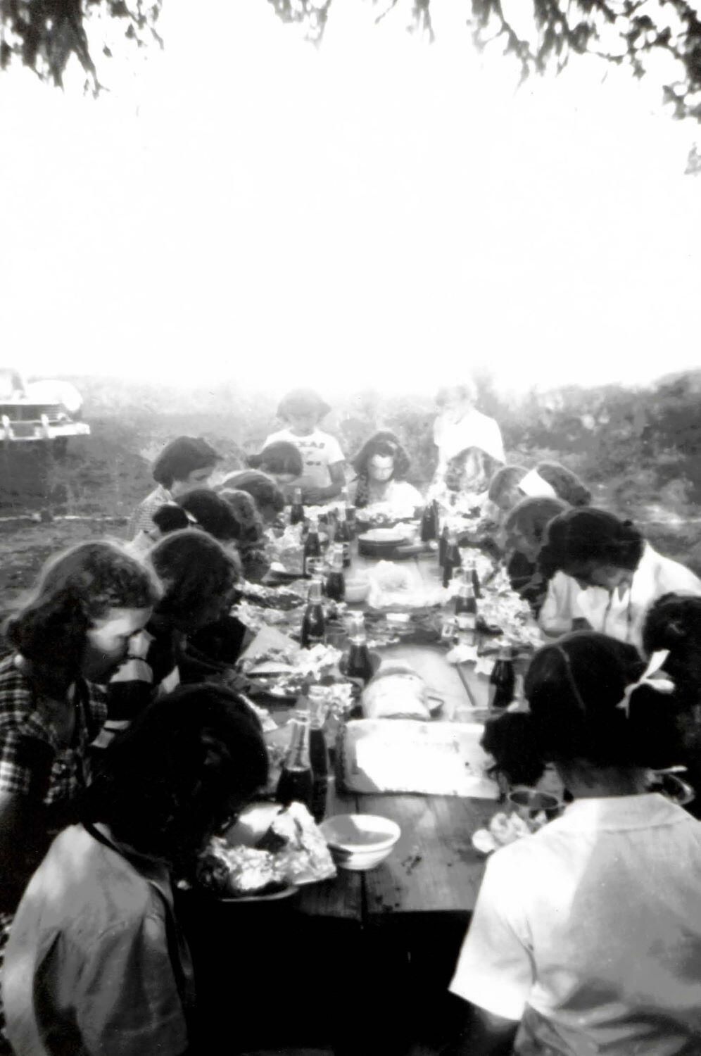 B/W, group of girls sitting around a table w/ food in front Possibly Girl Scouts of America