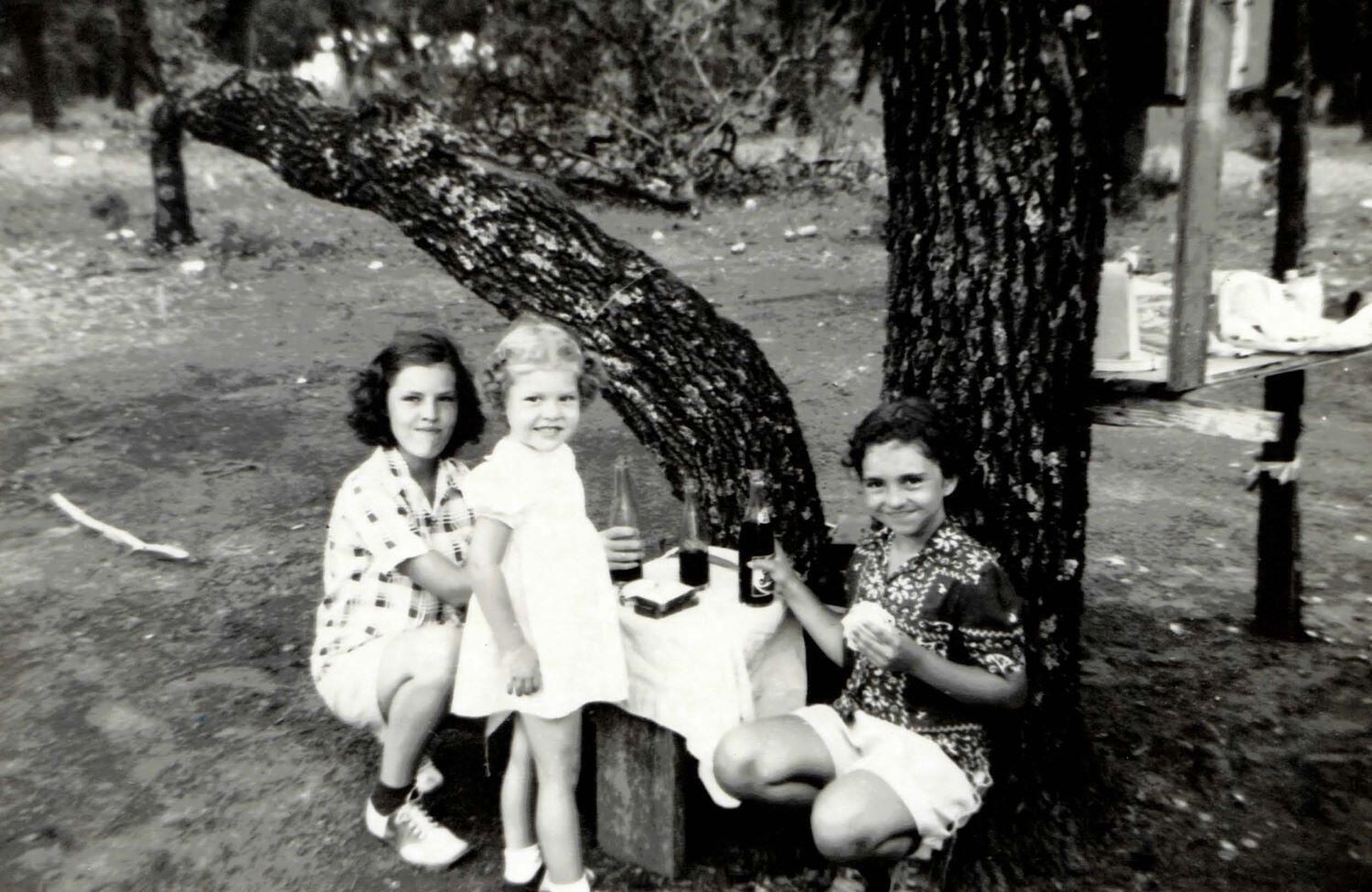 B/W, 2 young ladies & 1 girl eating off a crate "table" next to tree Possibly Girl Scouts of America