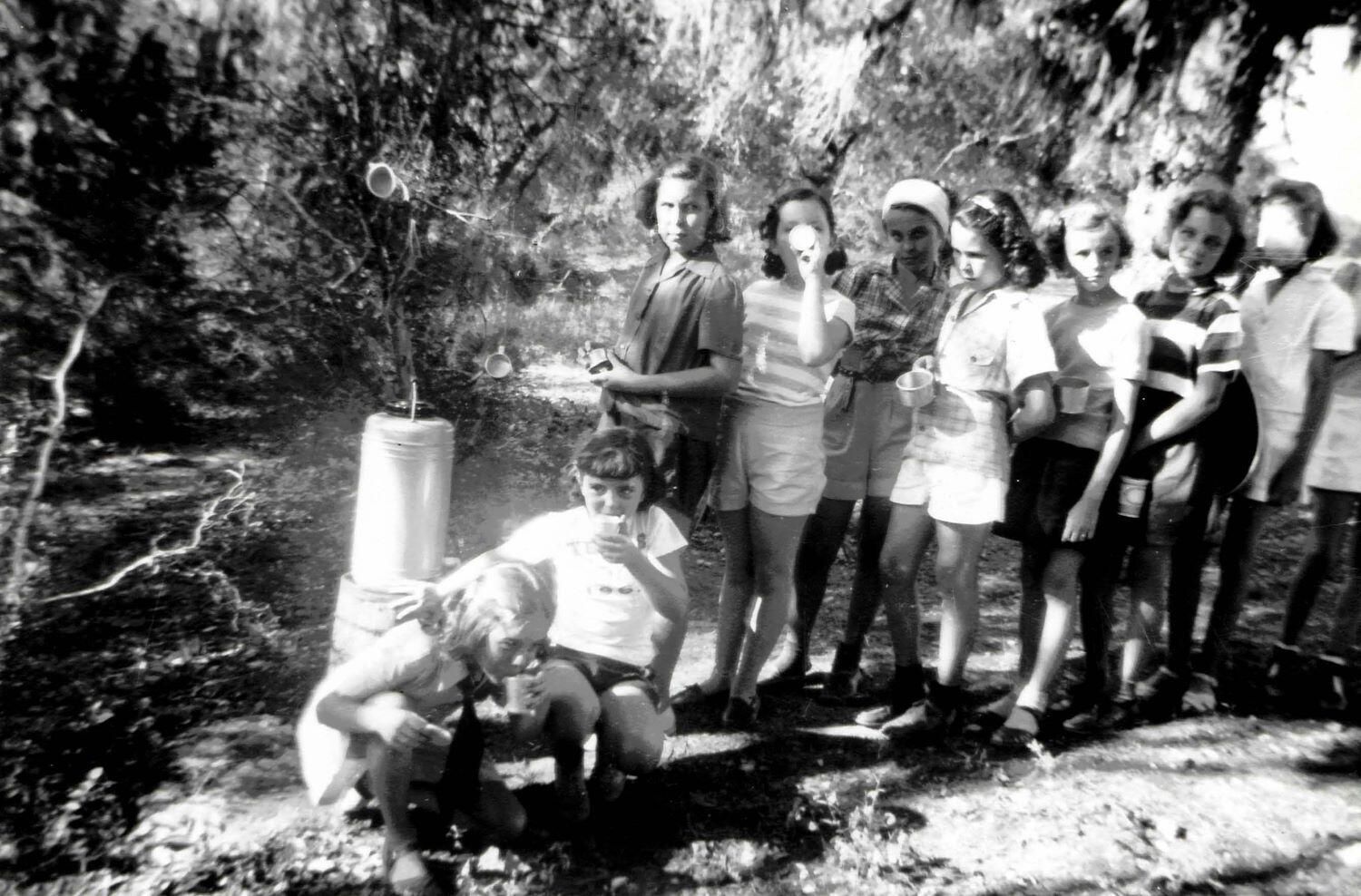 B/W, 2 young ladies kneeling drinking from cups, 7 young ladies standing in line Possibly Girl Scouts of America