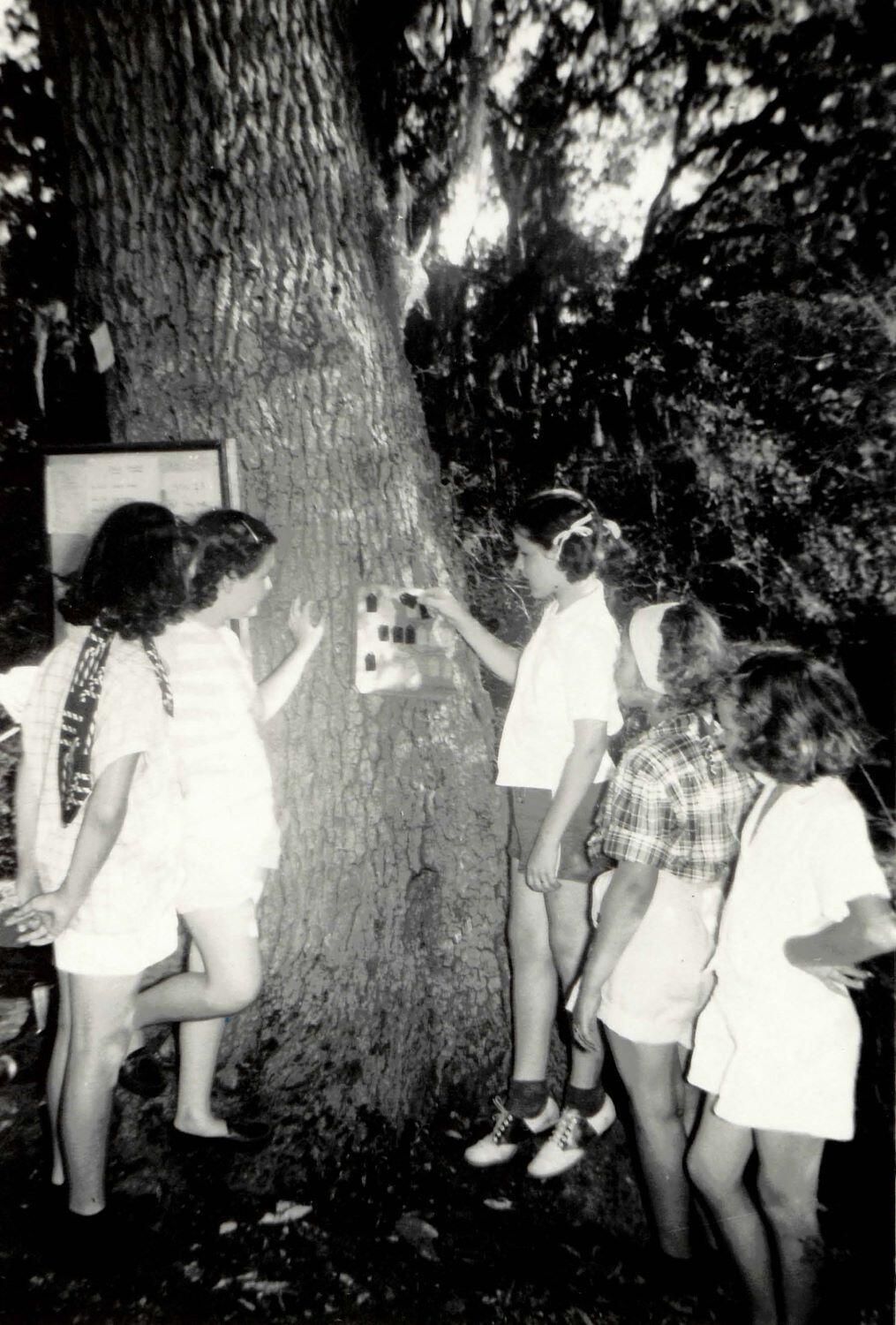 B/W, 5 young ladies studying chart attached to tree Possibly Girl Scouts of America