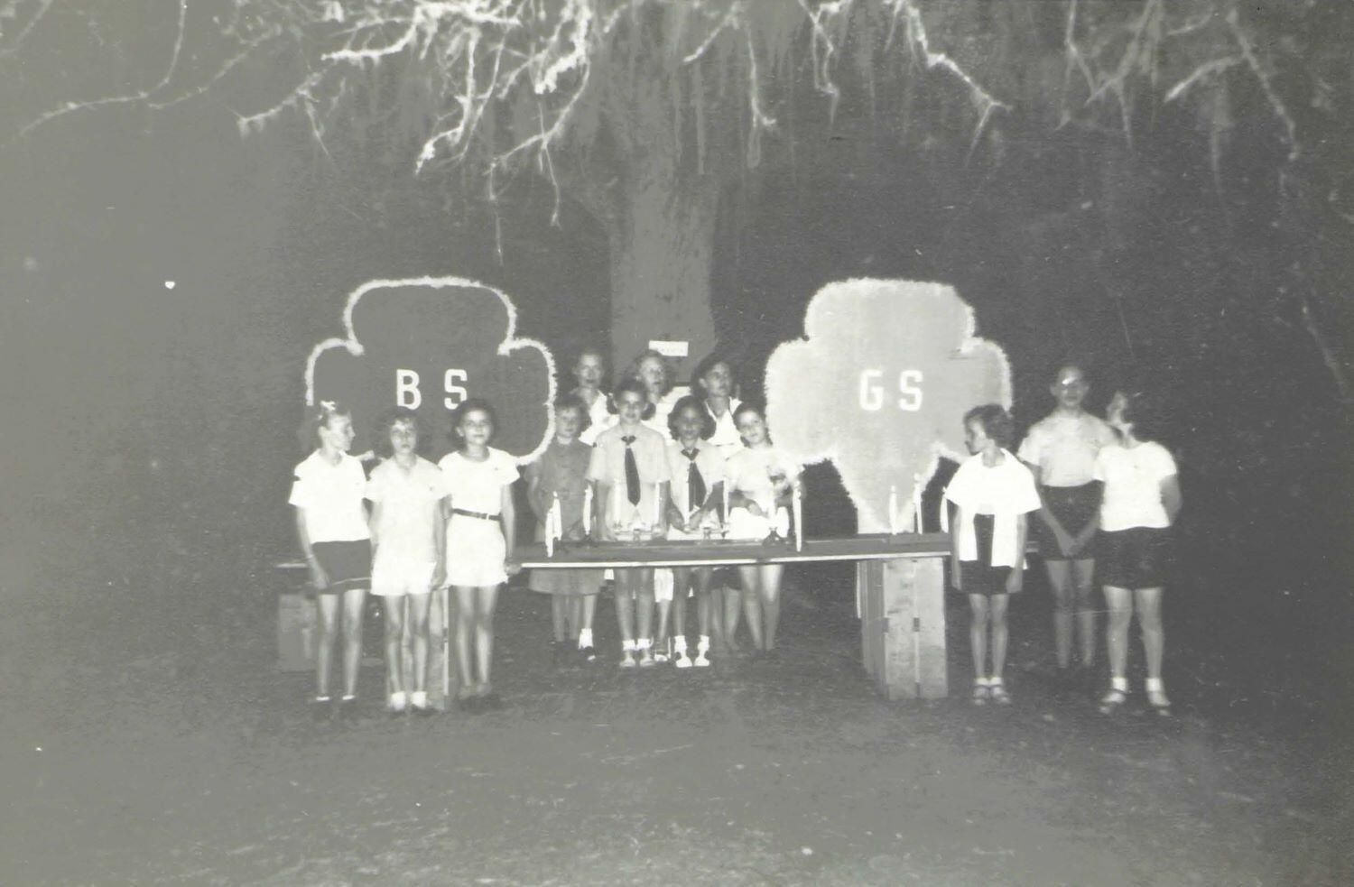 B/W, 13 young ladies standing around front ceremony table, 2 Girl Scout insignia shapes attached to table Possibly Girl Scouts of America