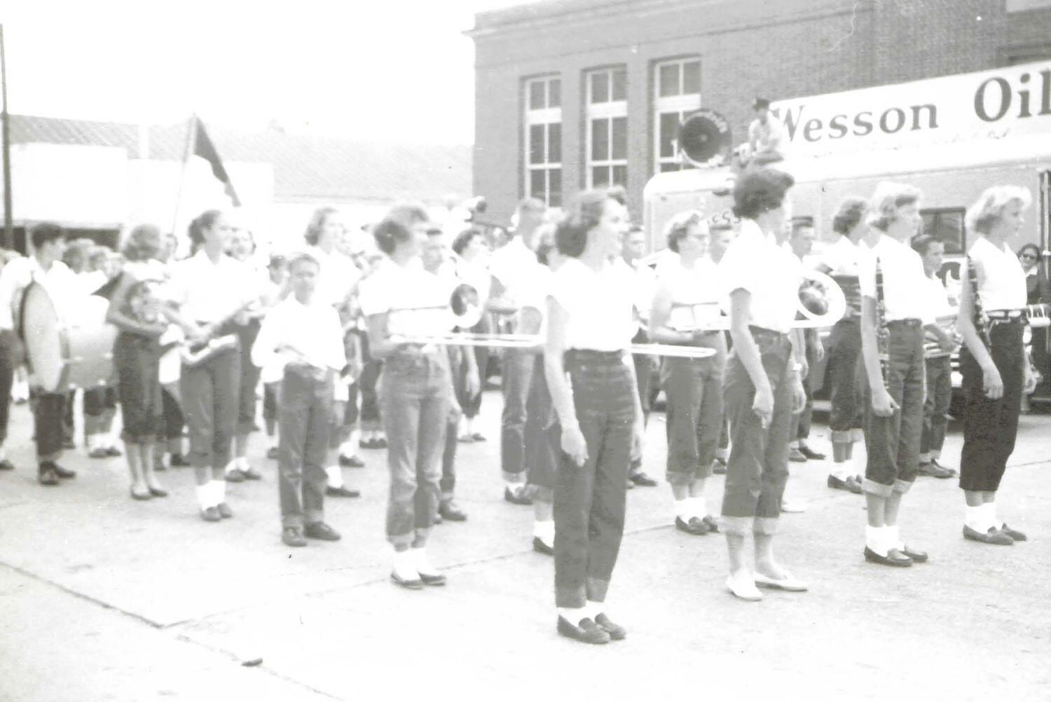 B/W, group of young ladies and gentlemen standing on street ready to march holding musical instruments Possibly Girl Scouts of America