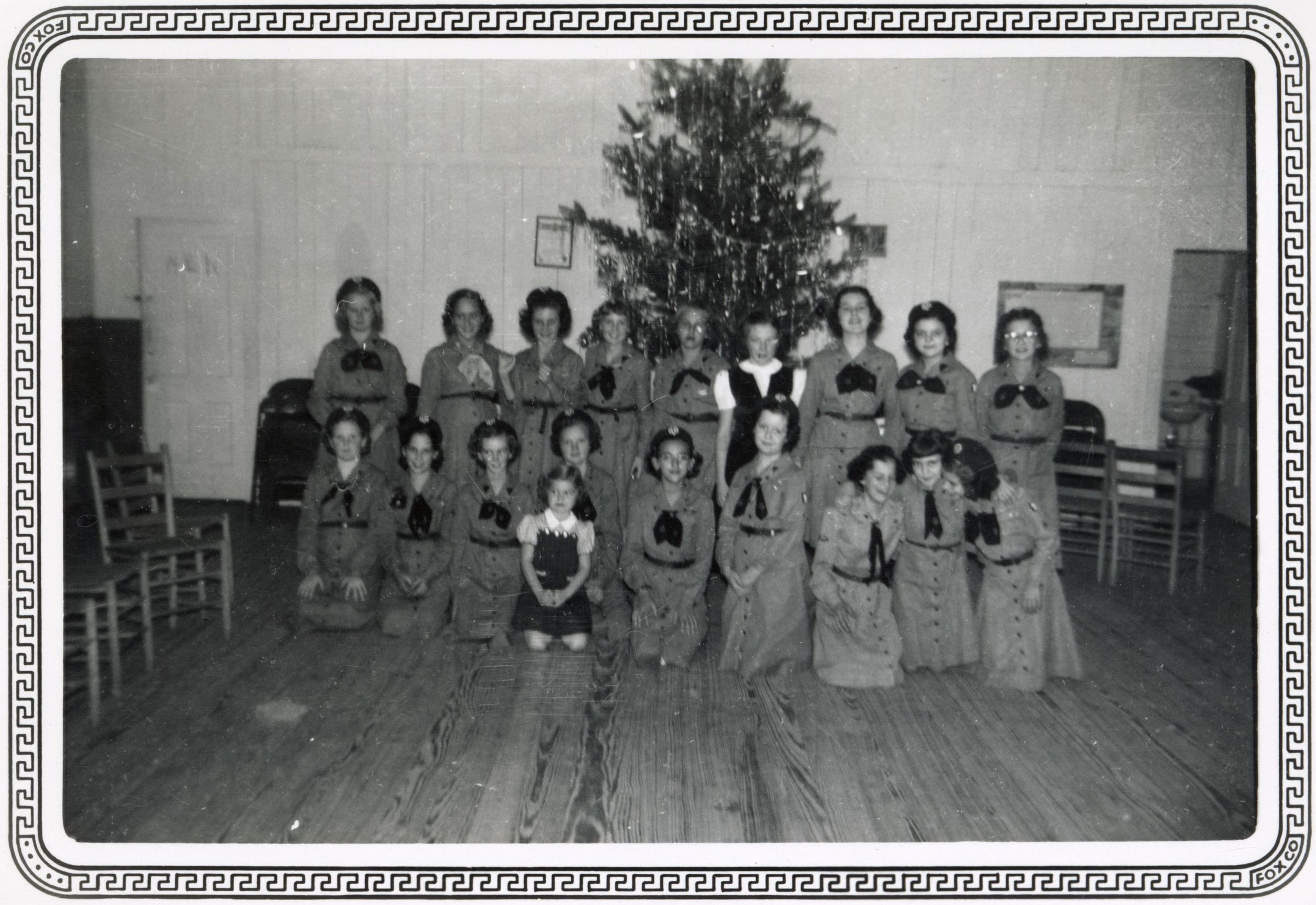 B/W, 19 young ladies in Girl Scout uniforms kneeling & standing in front of live Christmas tree in wooden building Possibly Girl Scouts of America