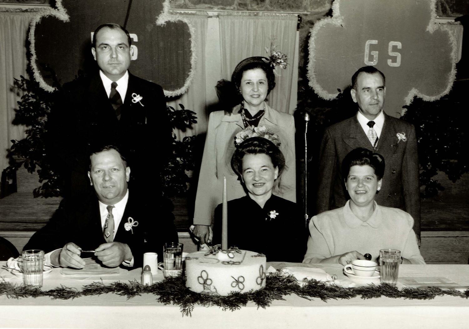 B/W, Girl Scout event (poss. Father Daughter Banquet) in America Legion Hall, 3 women & 3 men sitting & standing behind table Possibly Girl Scouts of America