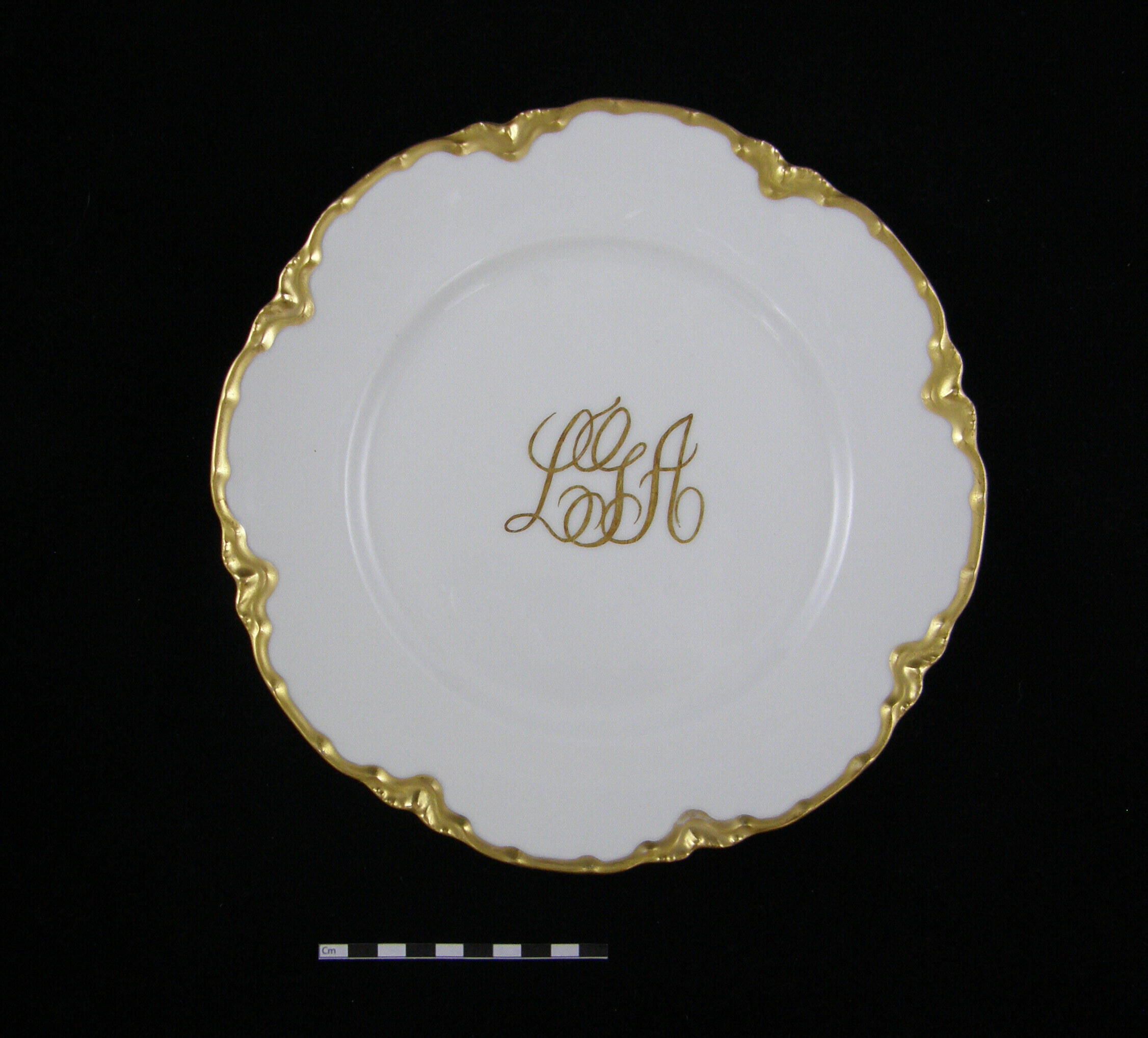 Dinner; white ceramic with hand painted gold accents and LGA; Haviland; made around 1905 for Linda Giddings Anderson (age 19) for her wedding to Edmund Pickens Anderson from Waxahachie, TX