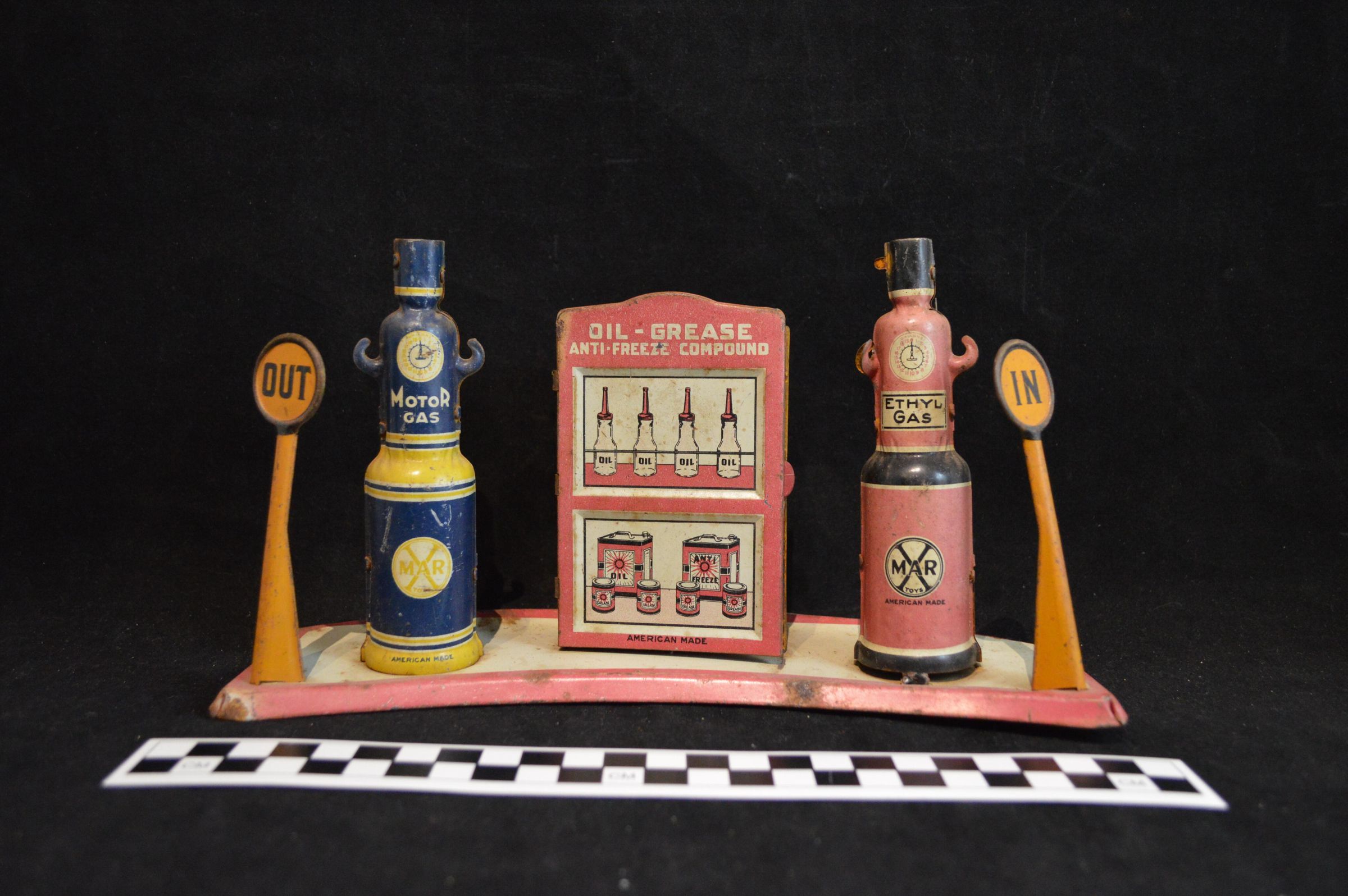 Tin, gas station, red, white, yellow, blue; Marx Toys