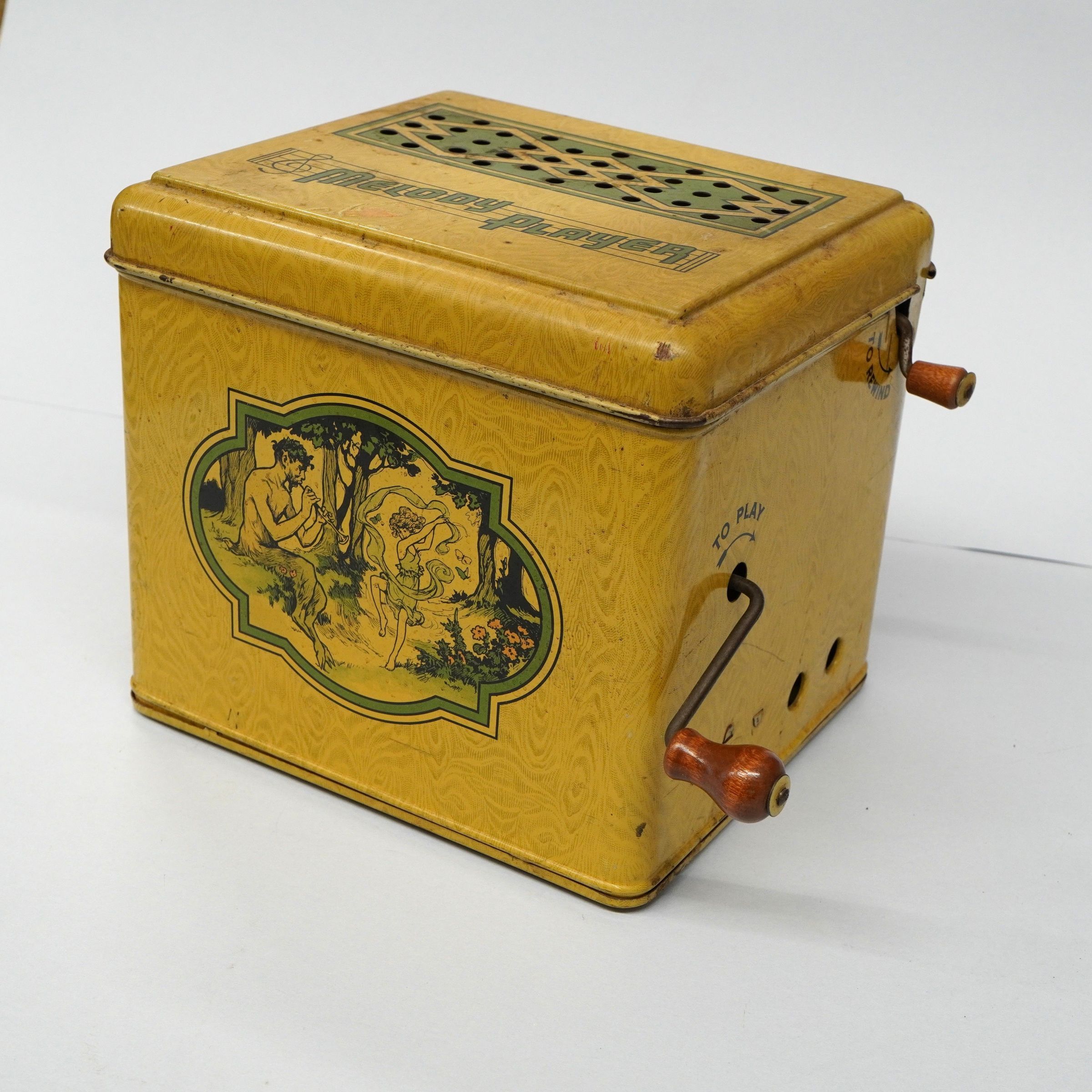 Melody Player music box; metal; This used music rolls which could be inserted in it and then the music played when the handle was turned