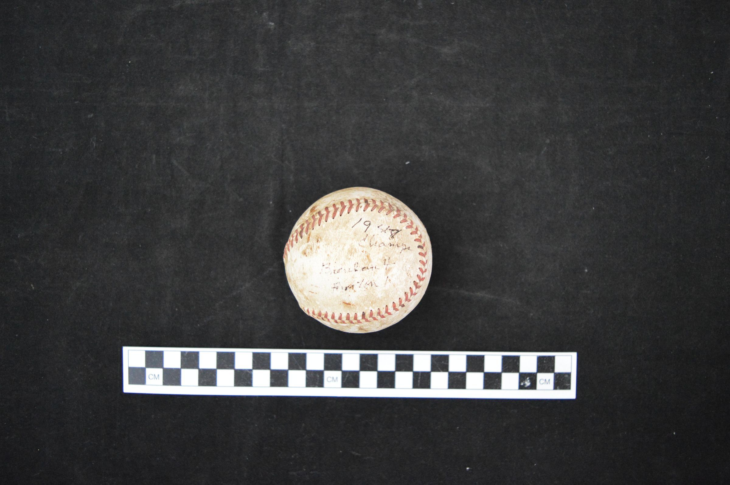 1948 Championship Victory ball; Brenham 4 vs. Burton 1; leather with red stitching; owned by Ernie Wilhelmsen, catcher for Sun Oil and Hot Shots
