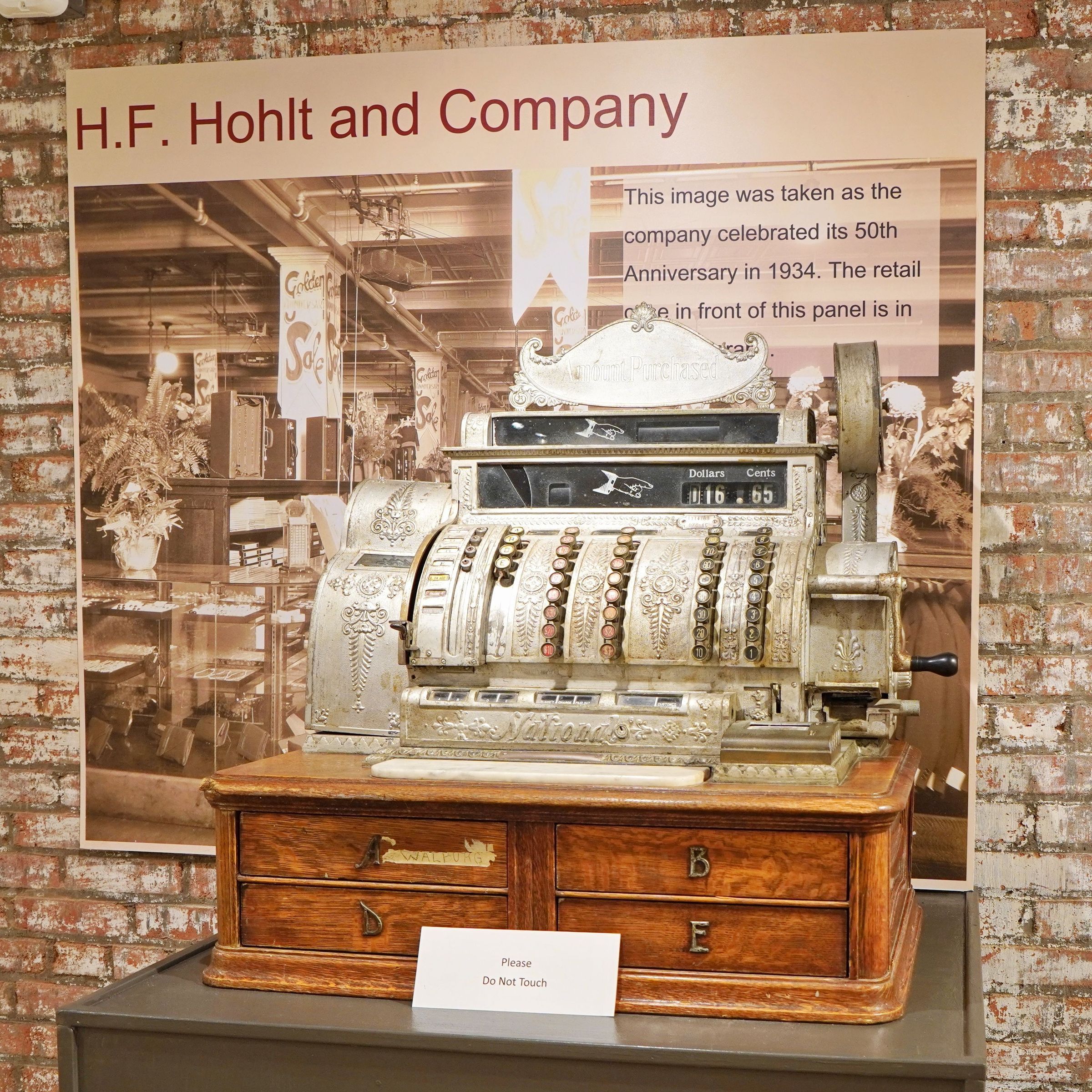 National Cash Register; Metal w/ 4 wooden drawers; electric& hand crank; used in Hohlt's Department Store; has a removable wooden panel in back