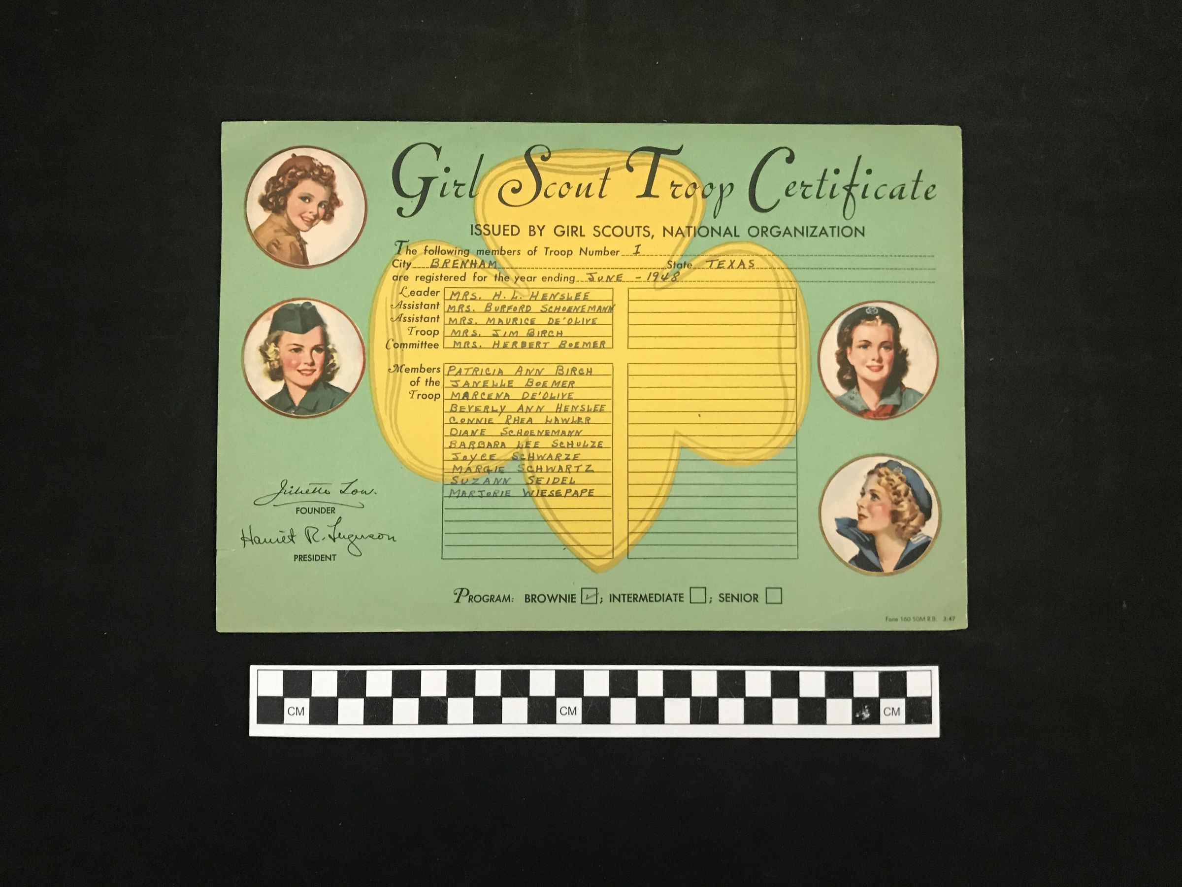 Girl Scout Troop Certificate, list of leaders & troop members, June 1948