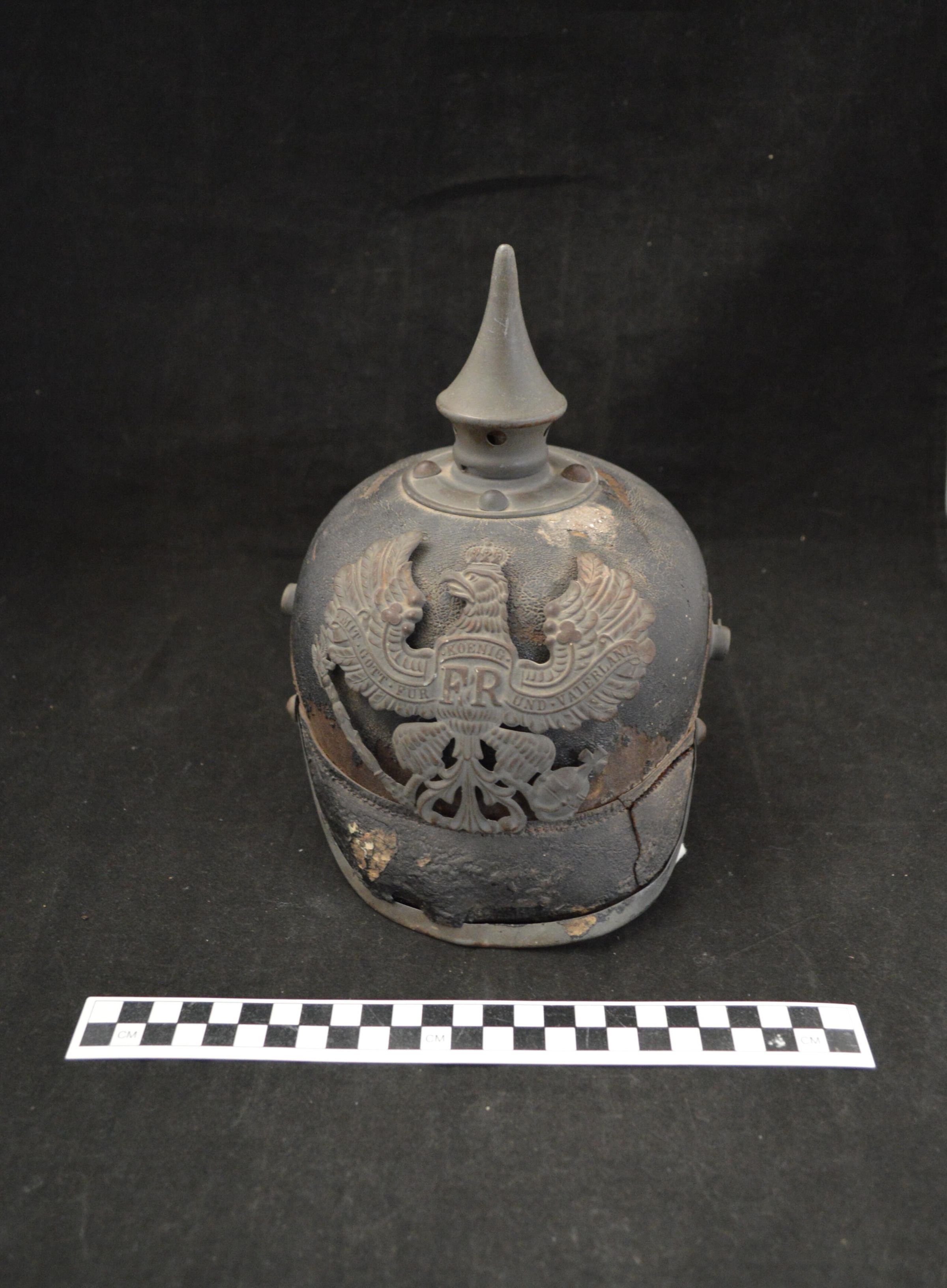 German Helmet (Pickelhaube Helmet, 1915); WWI; lacquered leather, steel and brass; spike on top; WWI souvenir brought back by Hans Scheider