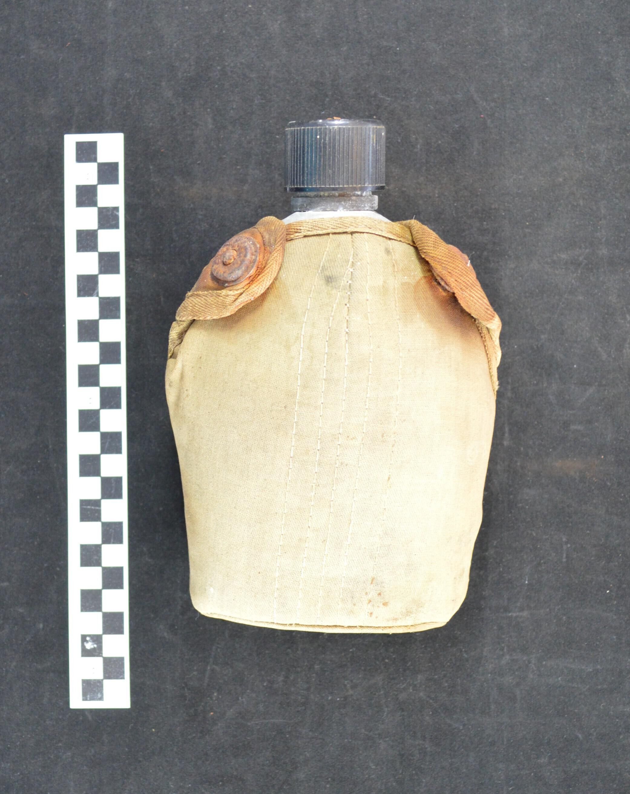 USA WW1 aluminum canteen US M1910; kidney-shaped with canvas cover; plastic cap (kept) replaced with aluminum one is secured with a short length of chain connected neck; canvas cover has two flaps on top fitting around spout of canteen and secured in front with metal fasteners