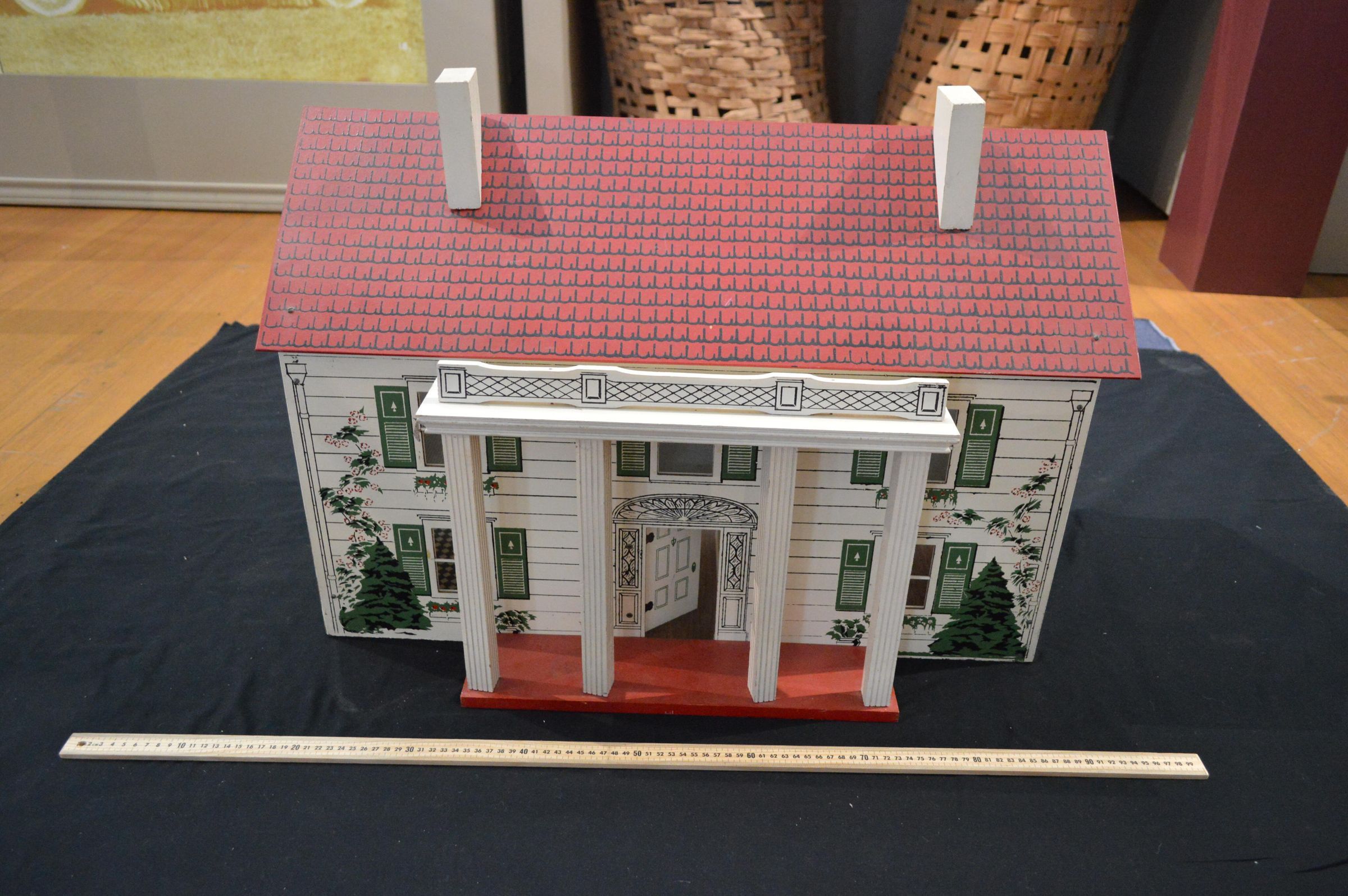 Dollhouse; wooden; 2 story; hand painted outside; interior has wall and floor coverings, electrified; 1940's; played with by Mrs. Van Dyke