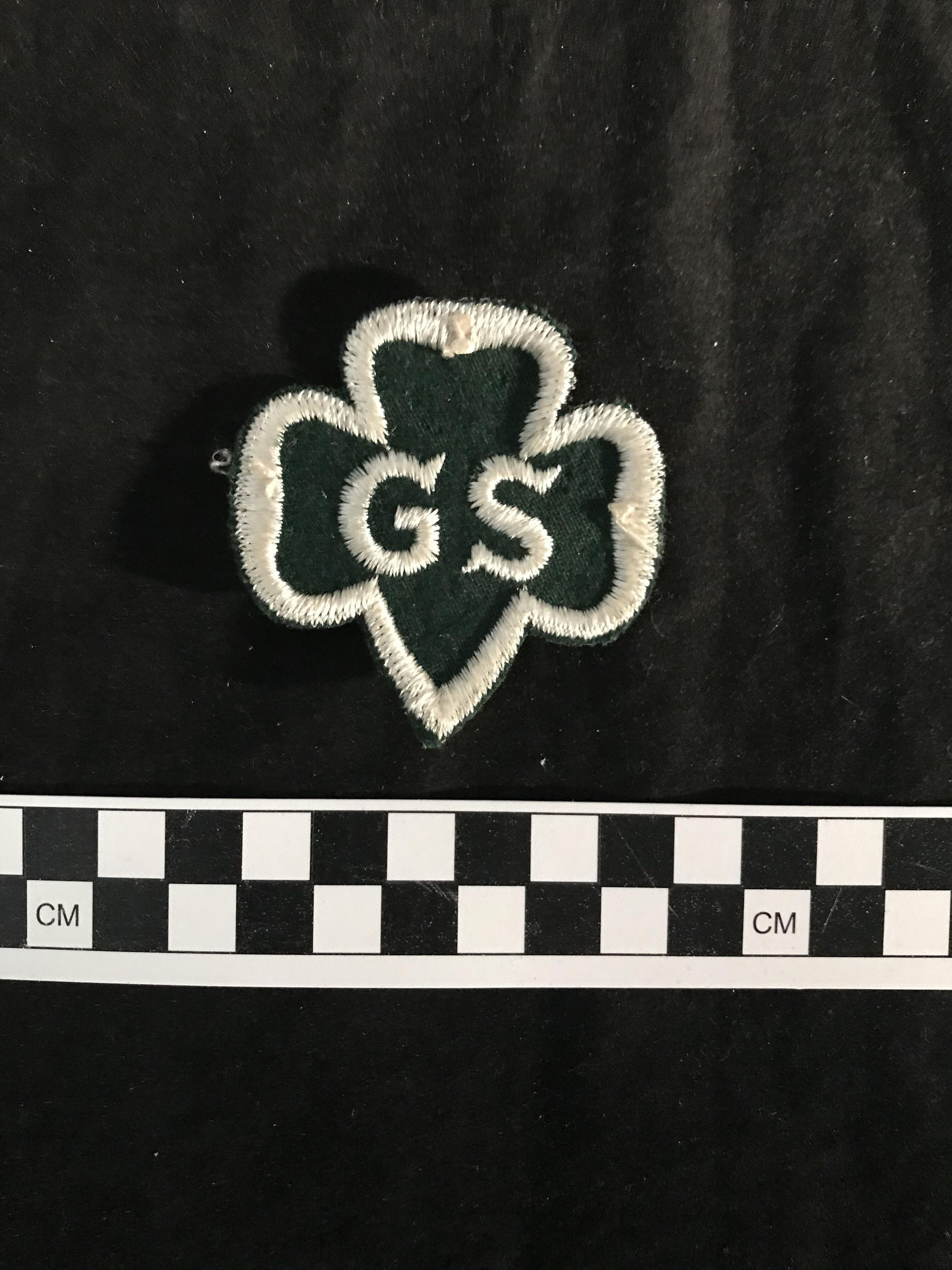 Girl Scout, shape of Girl Scout clover, white stitching outline & "GS" on dk green background