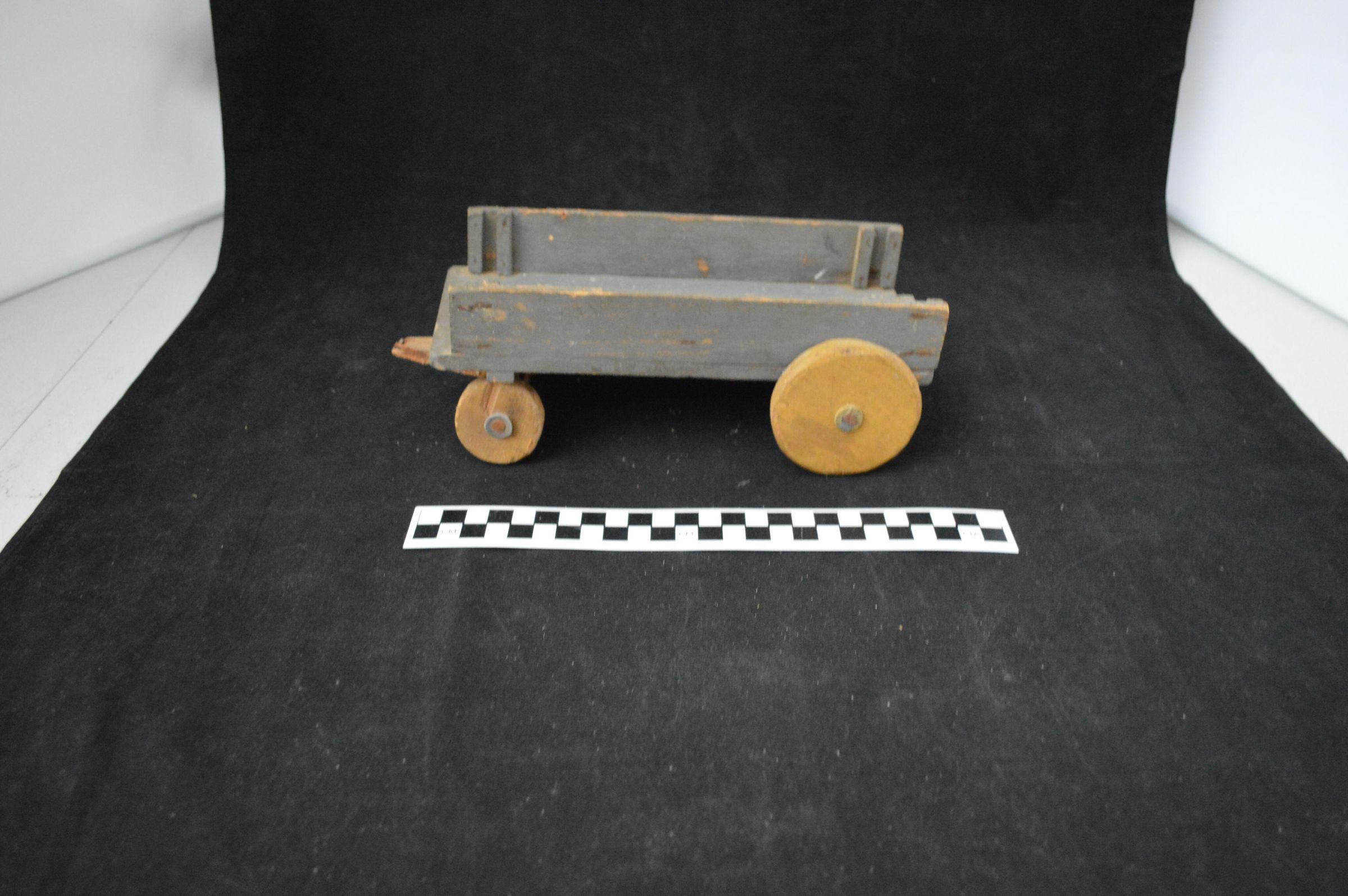 Wagon, wooden, homemade, blue body, yellow wheels Crafted by Postmaster Wilson Munz