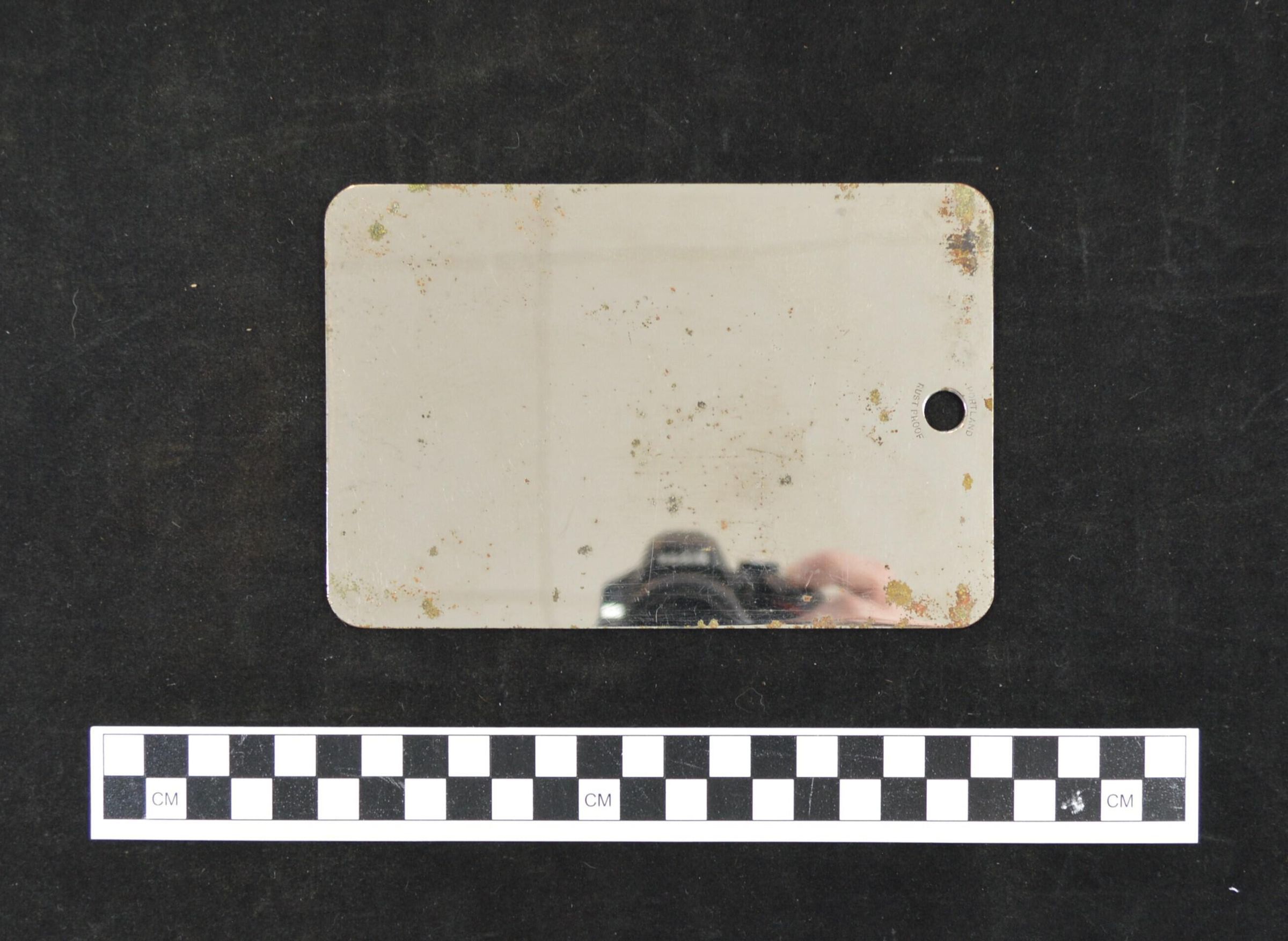WWI shaving trench mirror; small rectangular polished steel with hole on one side for hanging