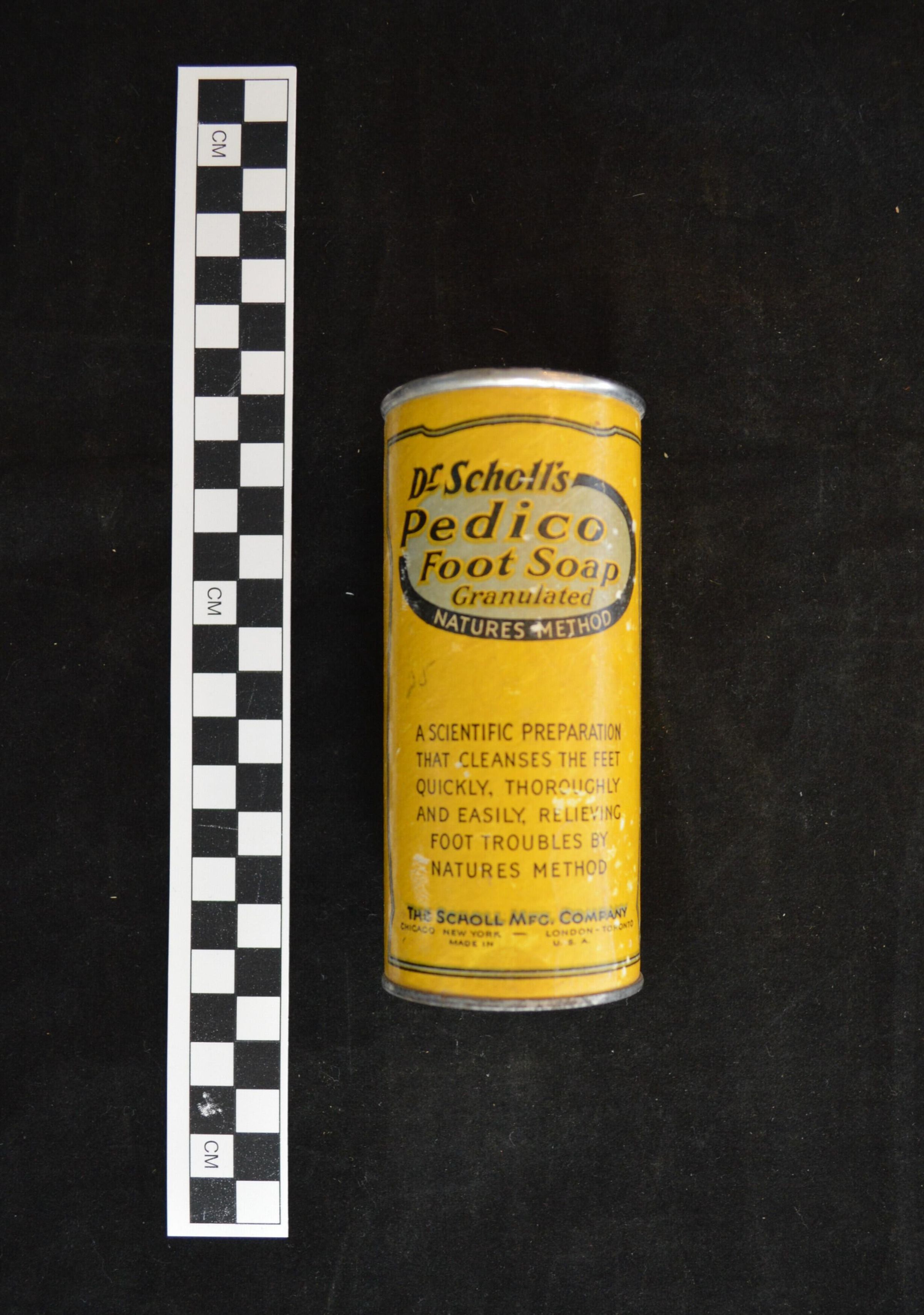 Dr. Scholl's foot powder tin; yellow paper label with black and blue printing; civilian product used by US army during WWI