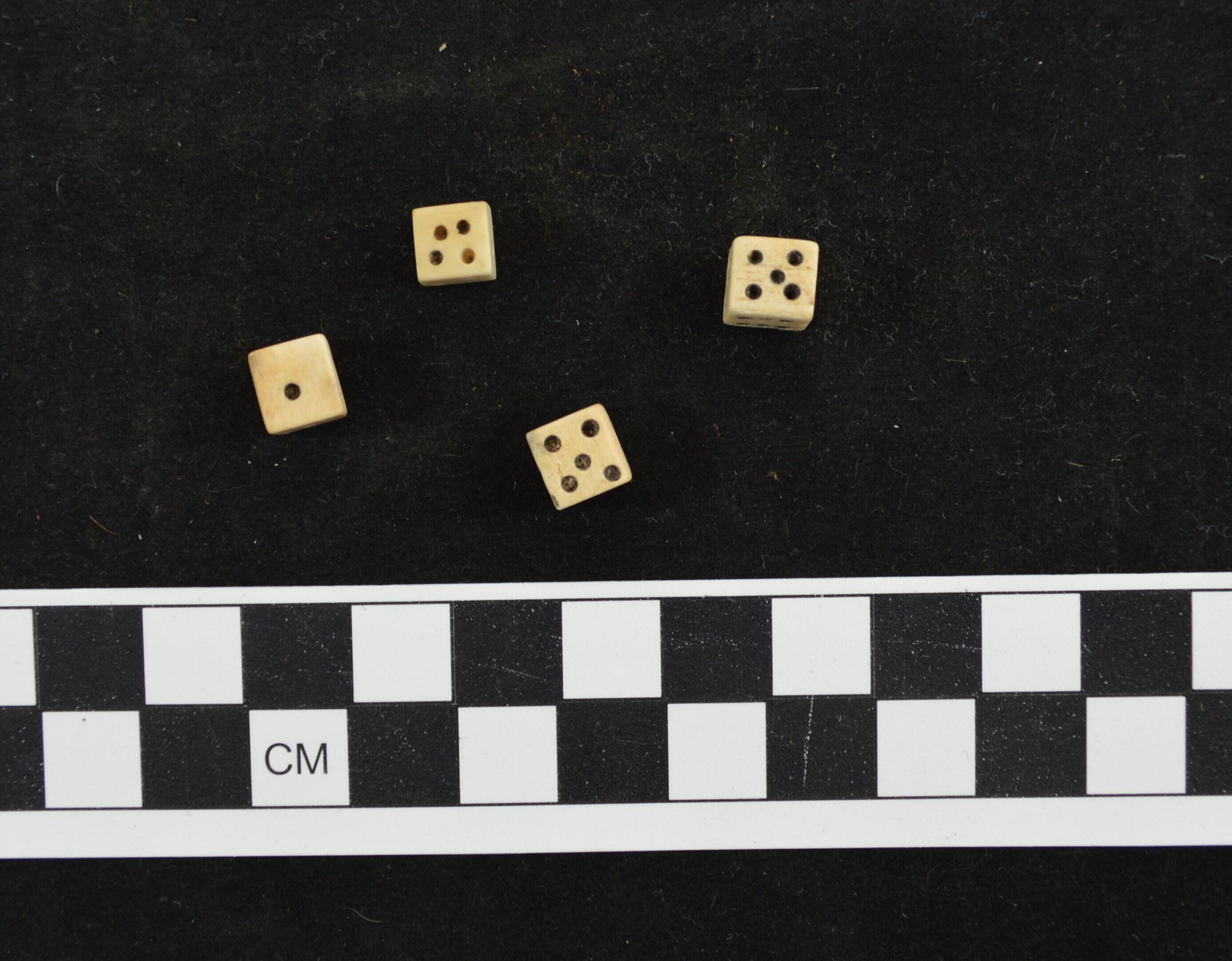 Four six sided dice; made in the trench by a French soldier; WWI; carved bone