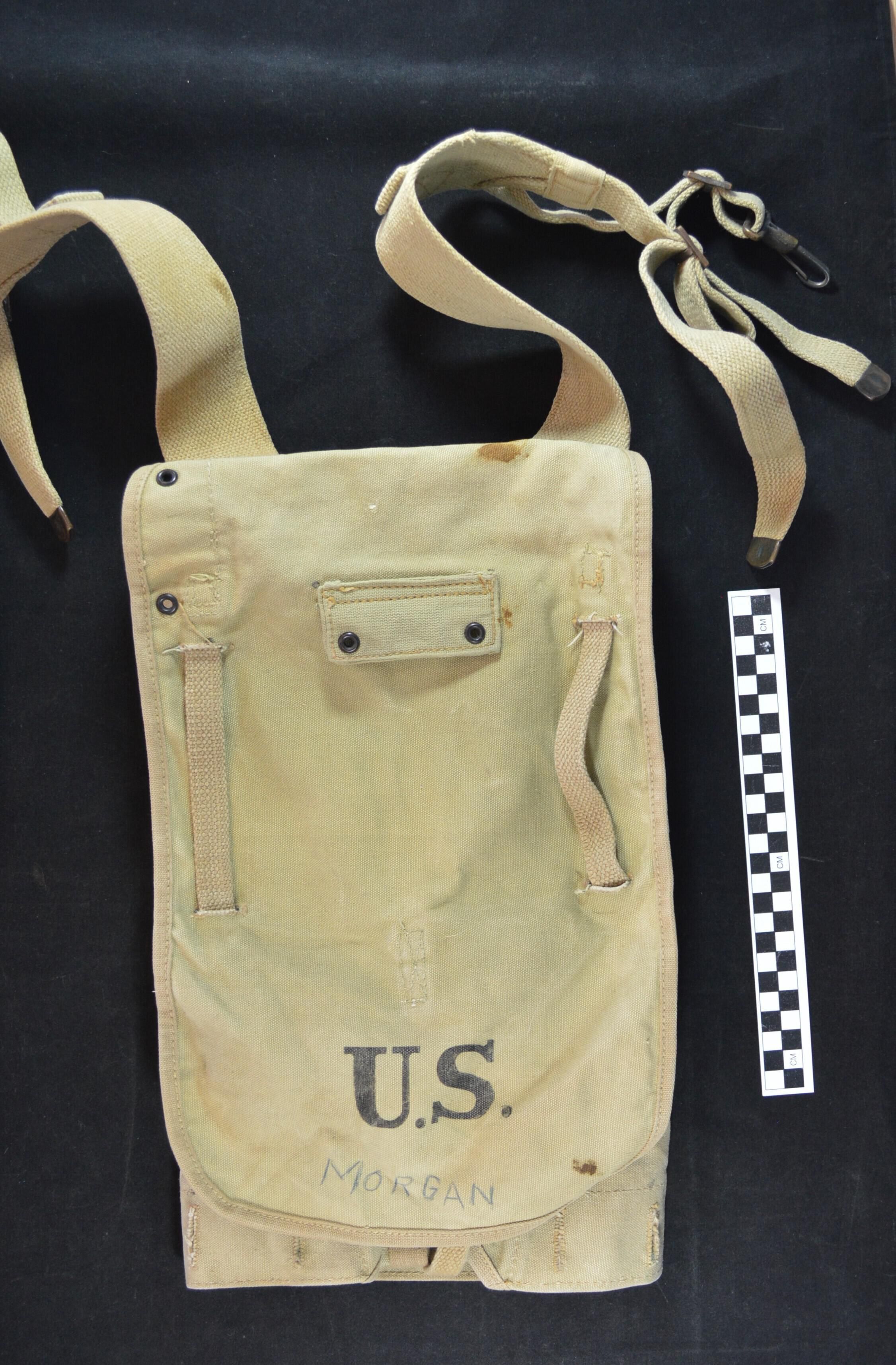 1917 WW1 army issued pack M1910; olive drab canvas with adjustable straps; "U.S." stamped in black on flap close to the bottom with "MORGAN" written under