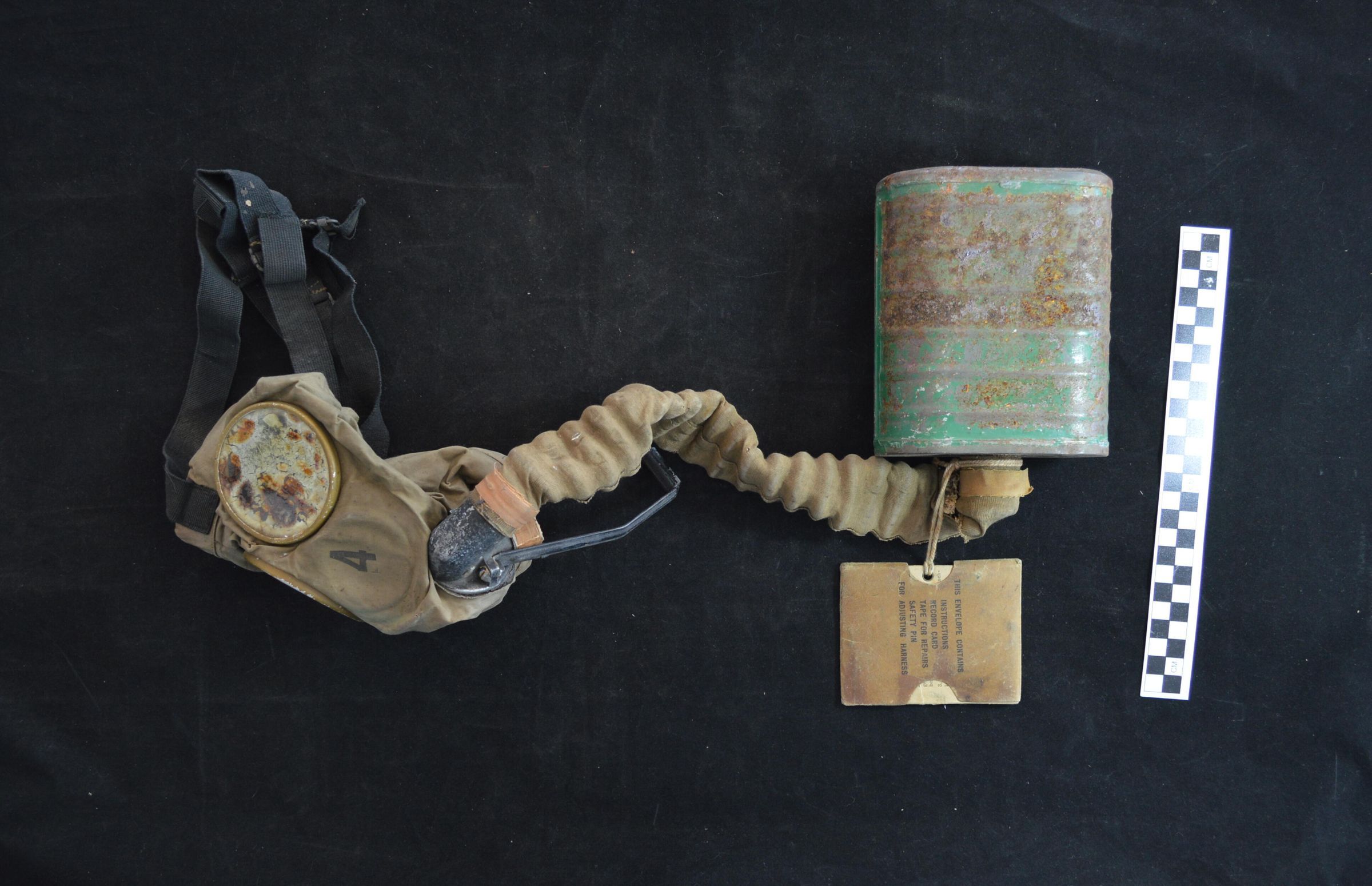 USA WWI gas mask and small box respirator; mask made from rubberized cloth and mica over eye opening; has adjustable straps to fit snuggly around head; respirator made form steel, attached to mask via hose; instruction booklet attached
