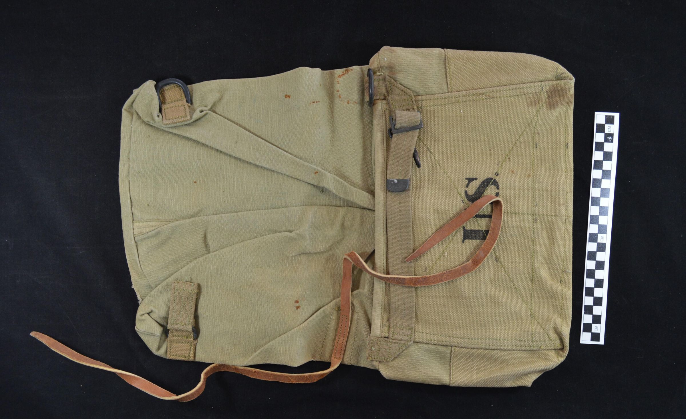 Canvas horse feed bag; WW1 M1912; nose bag style; canvas and steel; olive drab with black printed "U.S." on the top flap; 1917