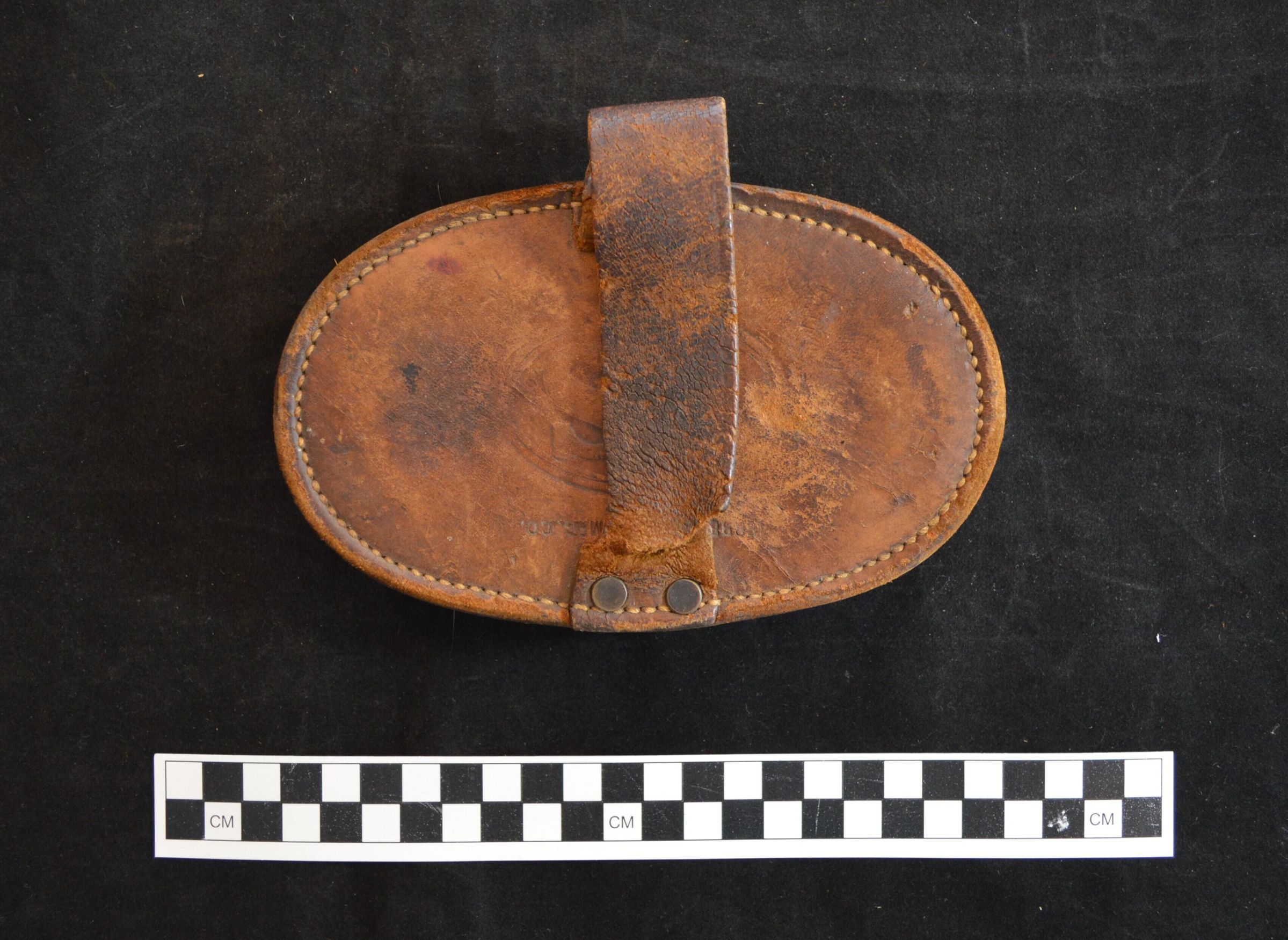 Calvary Horse Brush; brown leather covers wooden base with hair bristles, brown leather hand strap attached with nails; army issue, WW1; 1917