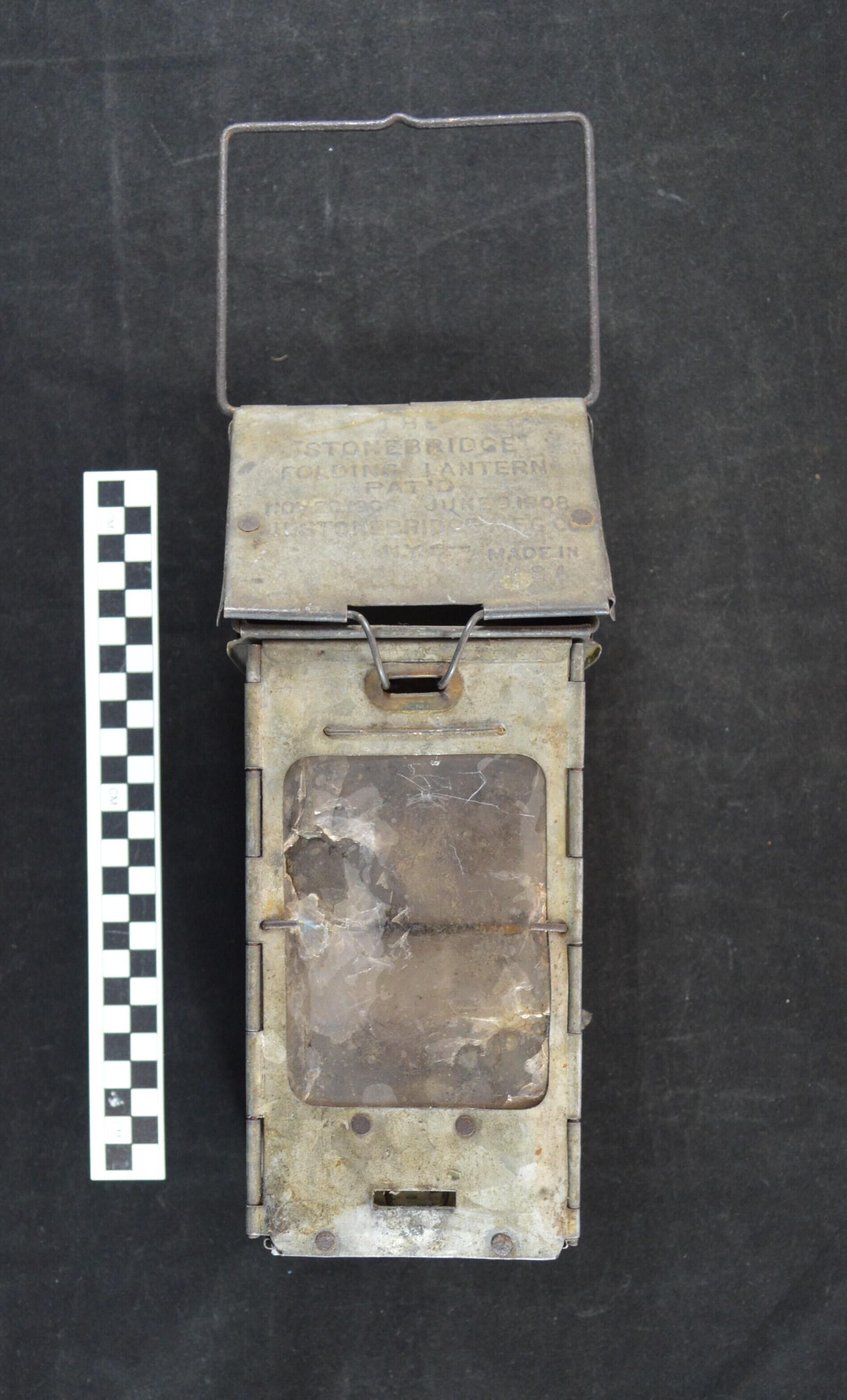 Stonebridge Folding Trench Lantern 1908; WWI USA; tin held together by rivets and hinge pins features windows covered with clear Mica panels, working side air vents, bale handle & a rear hole for mounting on a nail; ability to fold flat