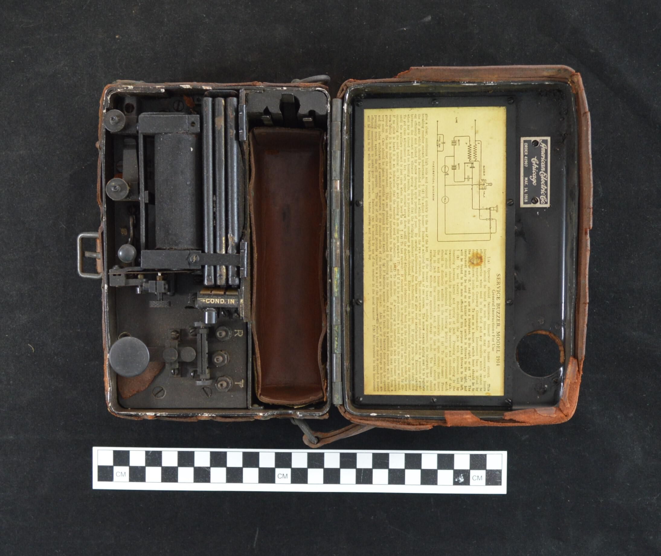 USA Army Signal Corps Telegraph Service Buzzer Model 1914; metal system enclosed in metal box covered in brown leather; headset plugs into the system with a wire; WWI