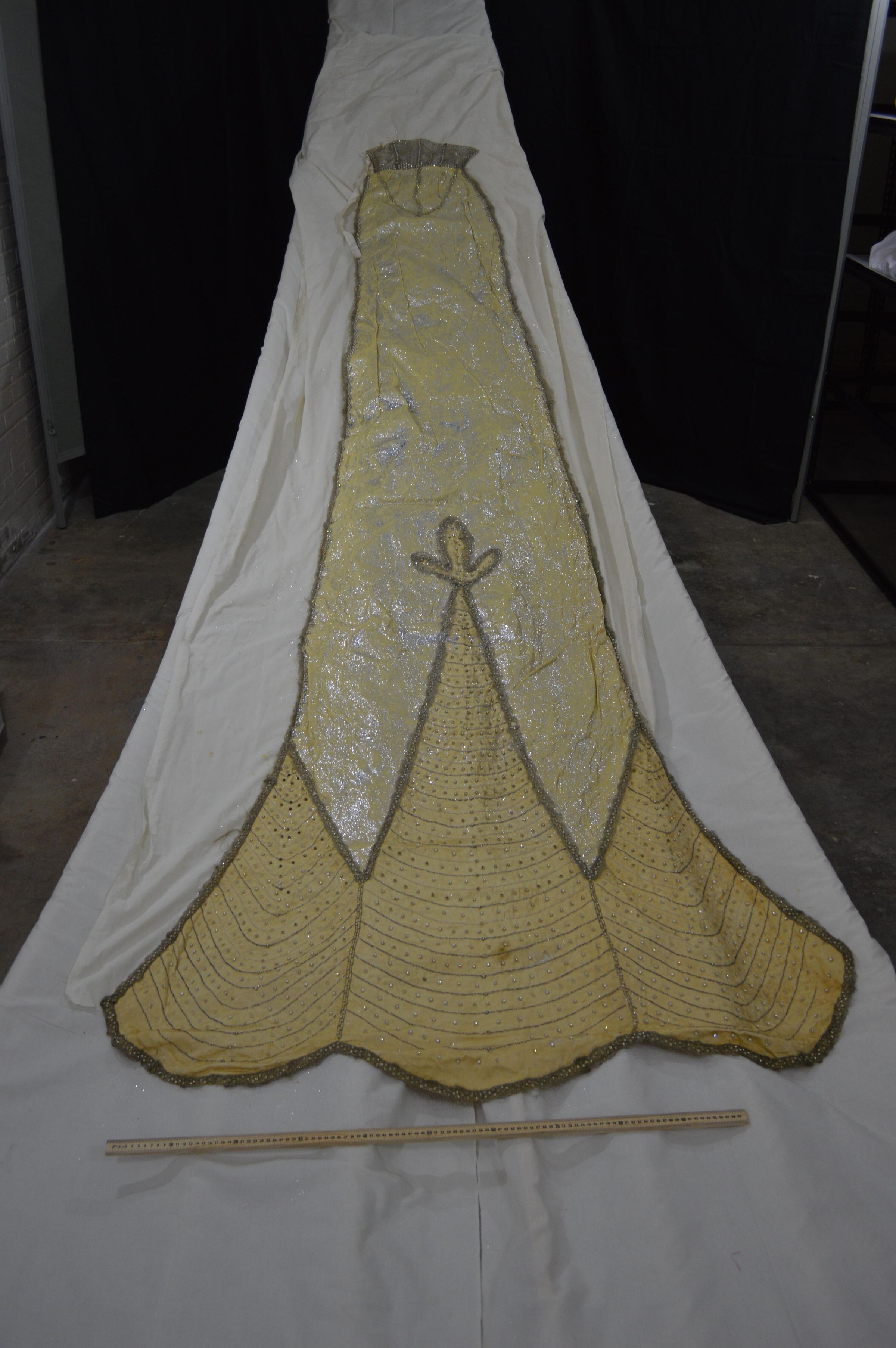 Sr. Queen Sommer, thin cream fabric, embellished in gold glitter and rhinestones, 126in x 50in