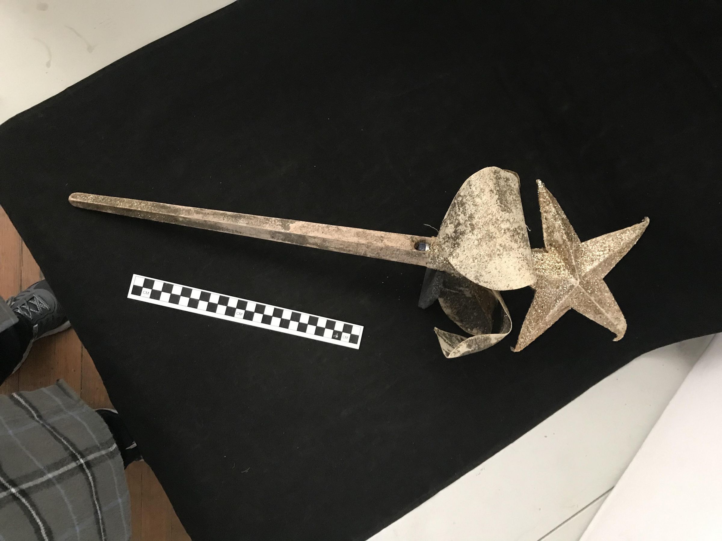 Sr. Queen Byrom, square base, cream w/ silver glitter, topped w/ cream & silver petals & gold star