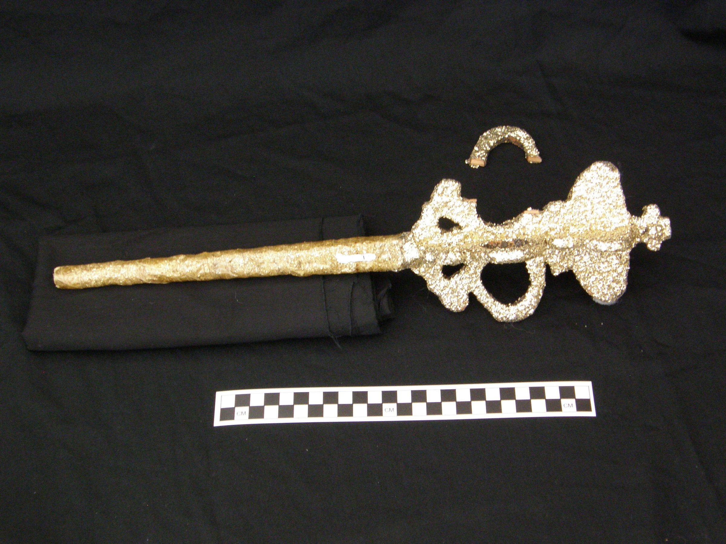 Sr. King Henze, wood w/ gold glitter, similar shape to sr. queen, top partially broken