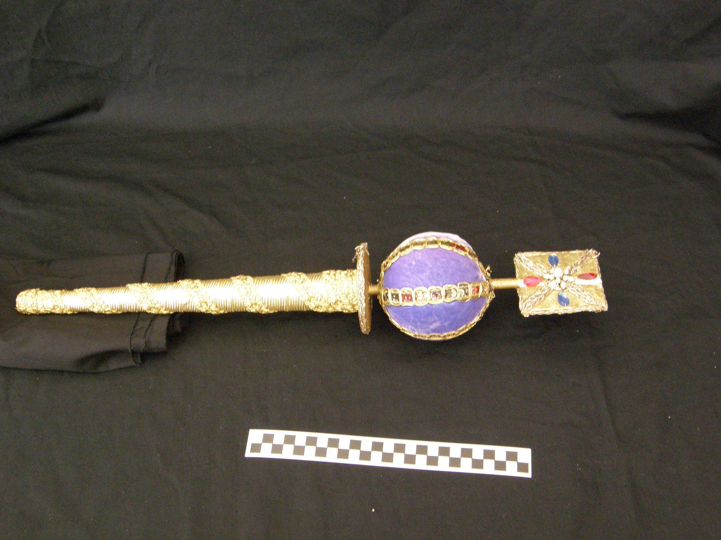 Sr. King O'Malley, faded purple velvet ball, gold square on top, faux gems