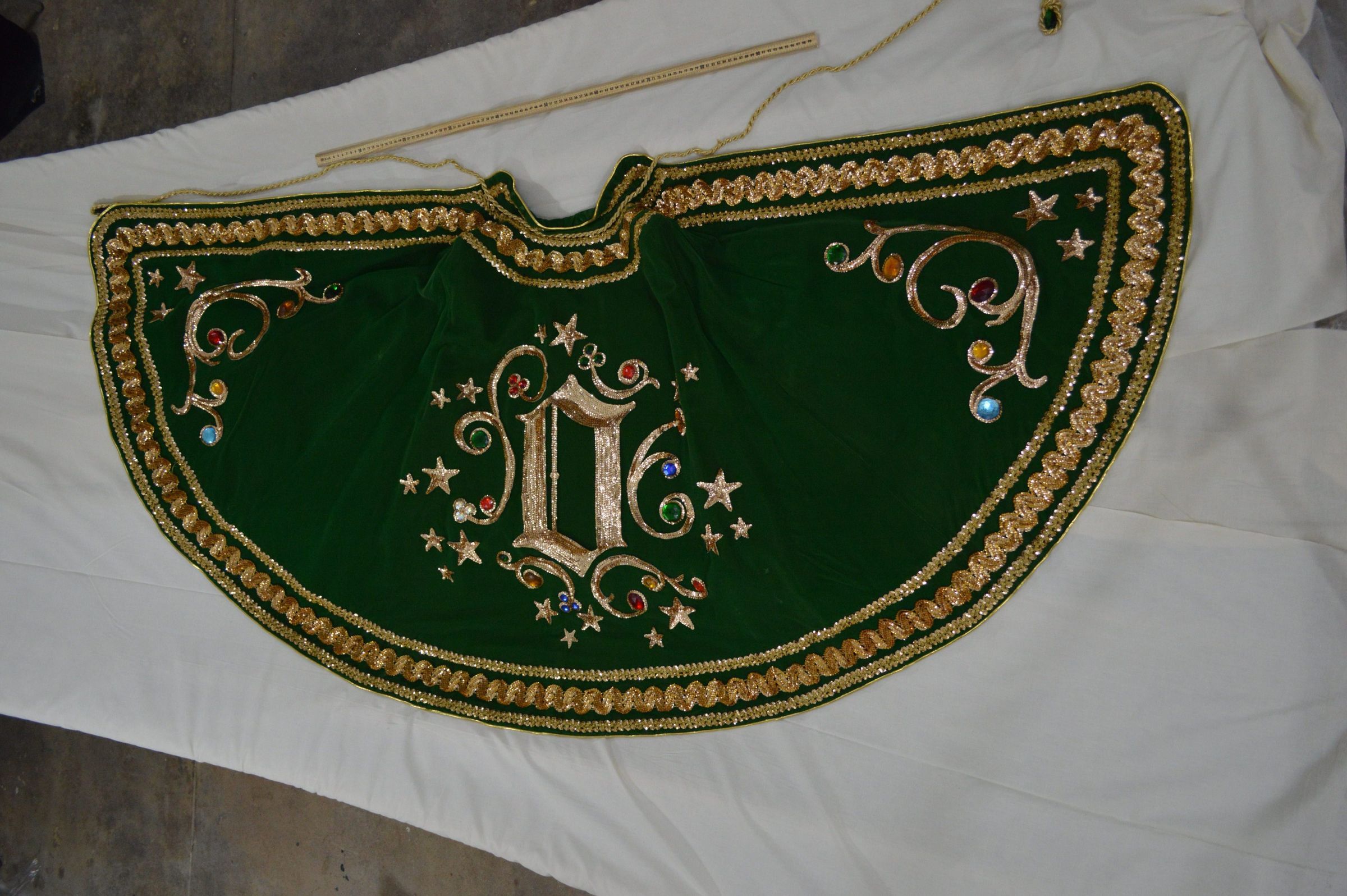 Sr. King O'Malley, green velvet, gold sequins, big O w/ stars & rhinestones on back, 41in x 8in