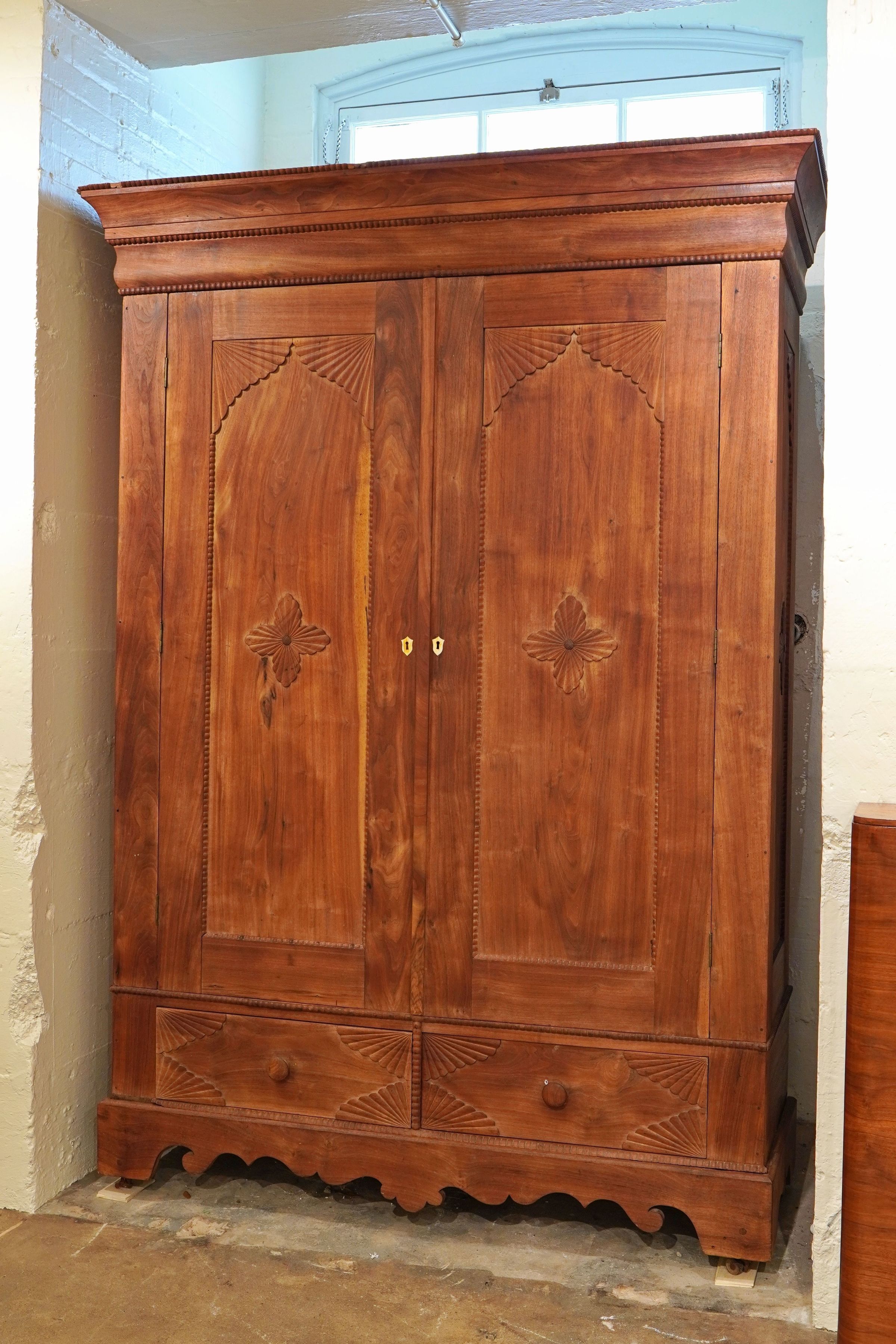 This beautiful antique wardrobe is currently on display at the Brenham Heritage Museum and was designed by Prussian-born cabinetmaker and Brenham resident Charles Blank. Blank became a United States citizen in 1858, and brought his European-style craftsmanship to Washington County, creating a variety of furniture pieces such as beds, desks, and cabinets out of Texas' native mesquite wood. Delicately carved, this ornate wardrobe demonstrates the craftsmanship of German furniture-making before the advent of mass production. More examples of furniture made by Charles Blank can be seen at the Winedale Historical Complex.