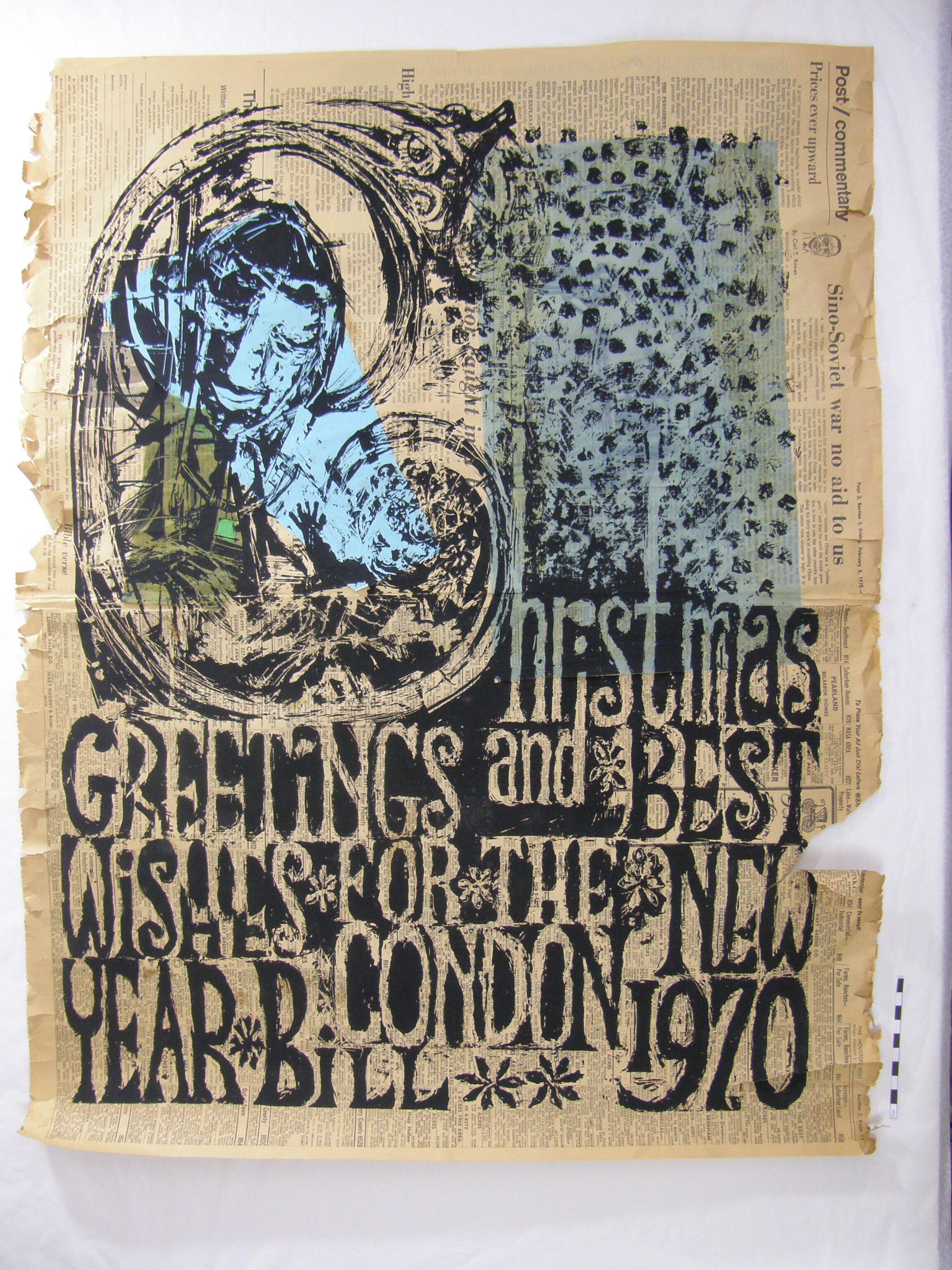 Christmas Card; created with newspaper, colored tissue paper, ink and paint; tan, blue, green and black; image of Madonna and Child with a greeting created using block printing; 1970; not framedMade/Created