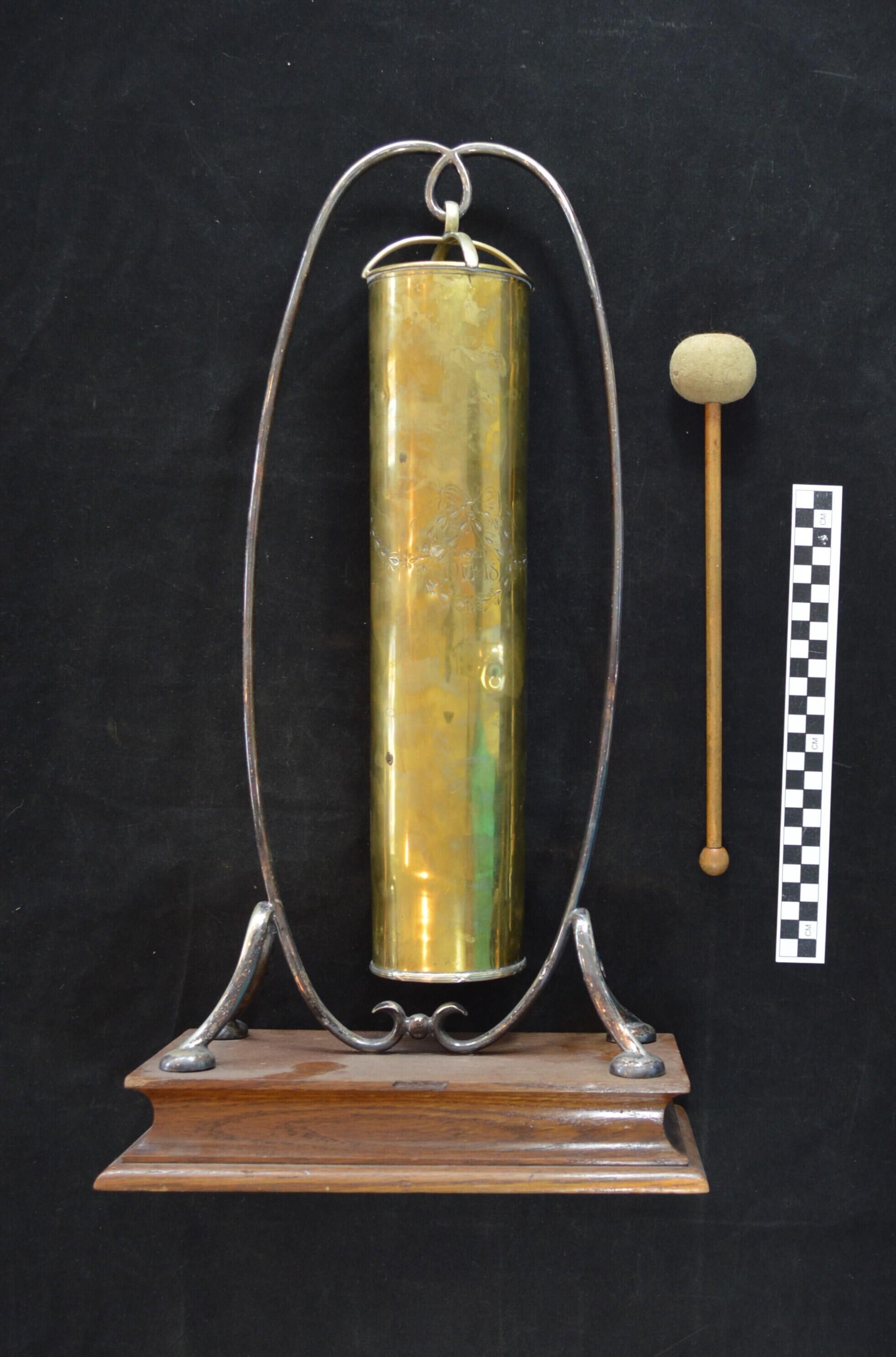 American Legion Bell, trench art; made from a French 75mm artillery shell turned into gong with hammer; displays engravings of a wreath with a bow on either side connected with garland that has inlayed silver; one wreath has " French 75m/m." engraved in the center and the other wreath has "USED 1914-18" engraved in the center; brass strips create a hanger for the shell; oak wooden base with silver metal support suspends the shell; hammer is made out of a wood and felt; used at an unknown American Legion Post after the war; 1920