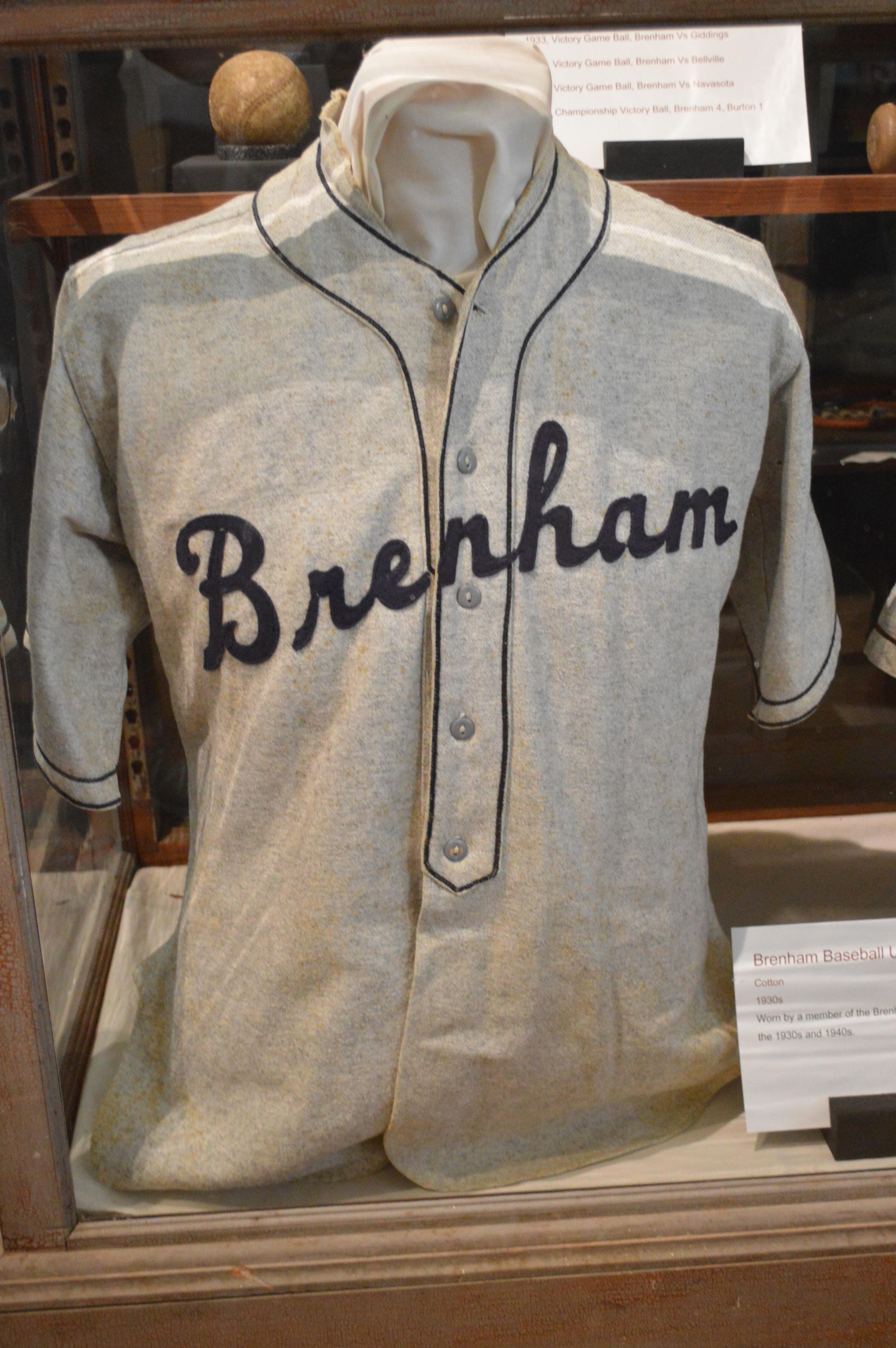 Baseball uniform; cotton; grey with navy accents; 5 buttons down front; navy "Brenham" on front and "12" on back; worn by a member of the Brenham Baseball Team in the 1930s and 1940s