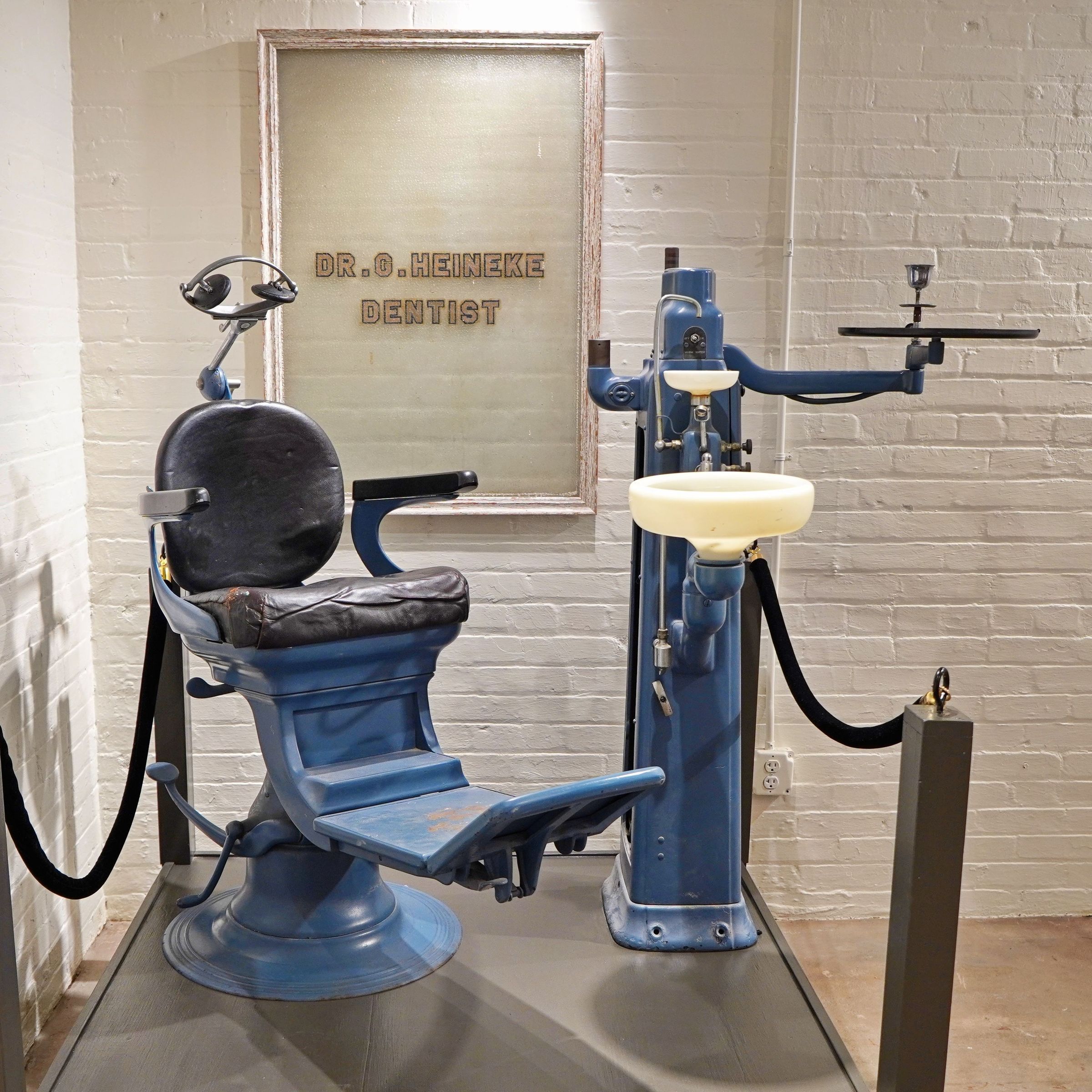 The chair displayed here is from the dental office of Dr. Gustav Heineke. He practiced dentistry in Brenham for 34 years. The chair was purchased by Dr. Robert A. Winkelmann who also practiced here for 30 years. The chair was eventually donated to this museum by Dr. Paul LaRoche III when He purchased the practice.