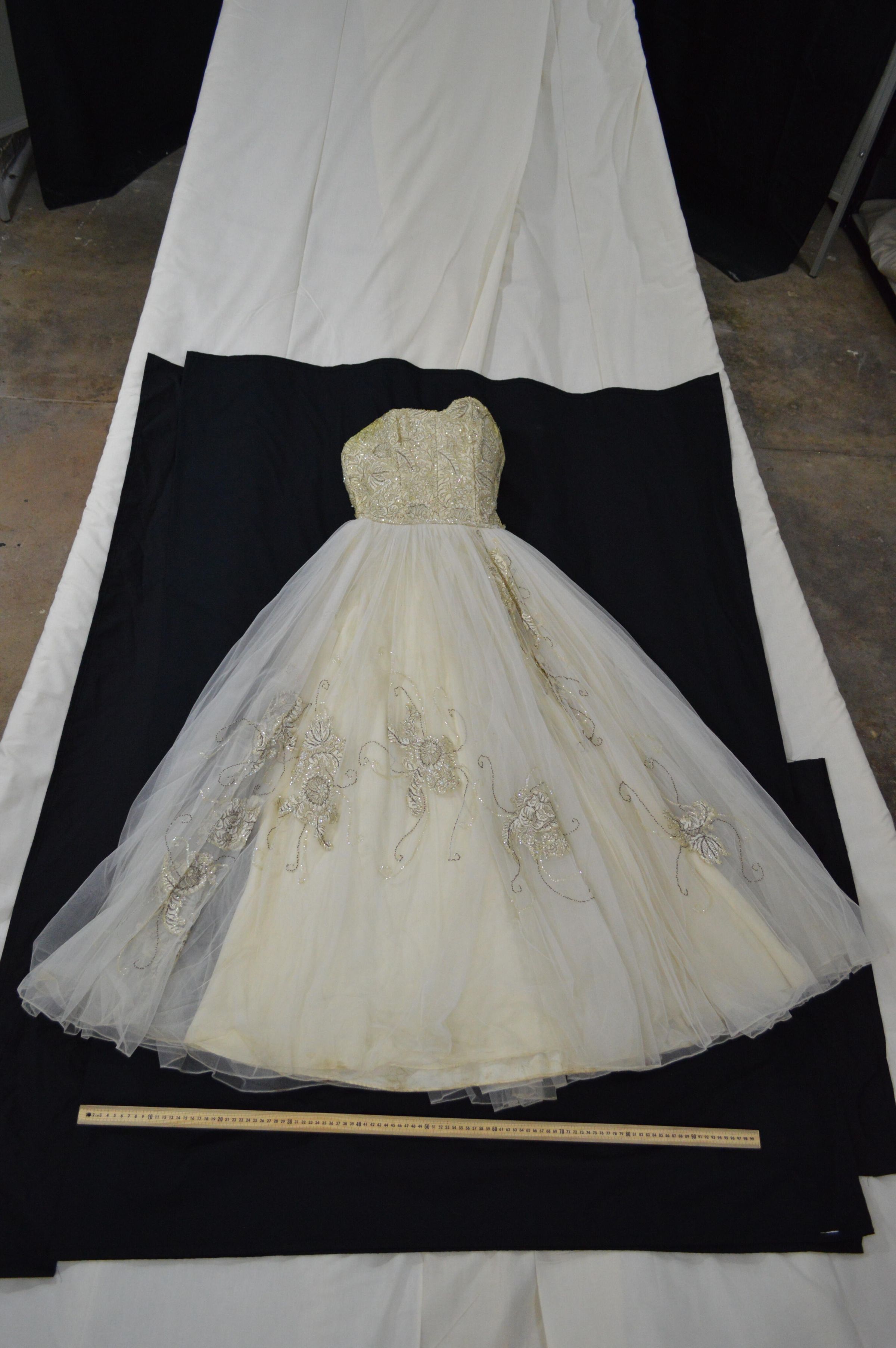 Sr Queen Byrom, off-white, sweetheart neckline, beaded top, tulle skirt w/ beaded overlay, 50 in X 55 in