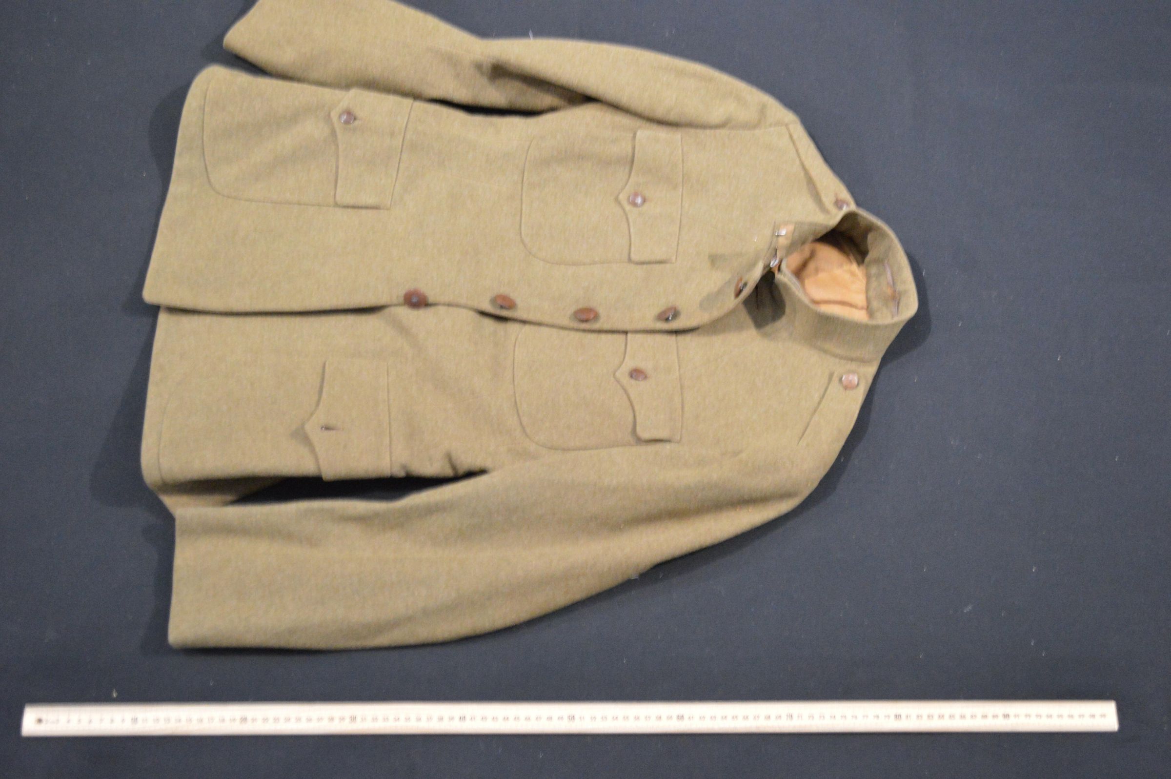 USA WW1 Service Coat, enlisted; tan wool coat with high collar; shoulder loops with a button close to neck; five button fastening front, and plain cuffs; four pockets in front with two on each side