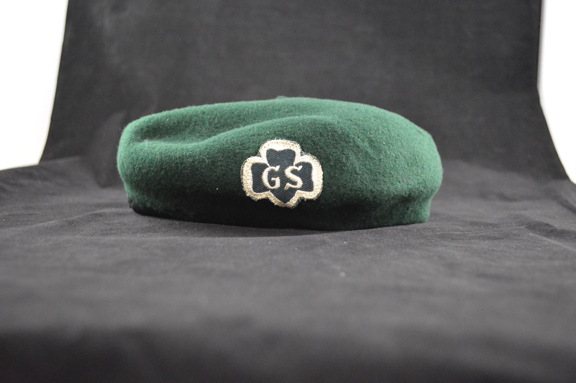 Beret, drk green 100% wool, girl scout patch sewn on, owned by Henslee